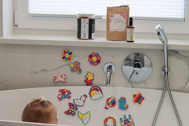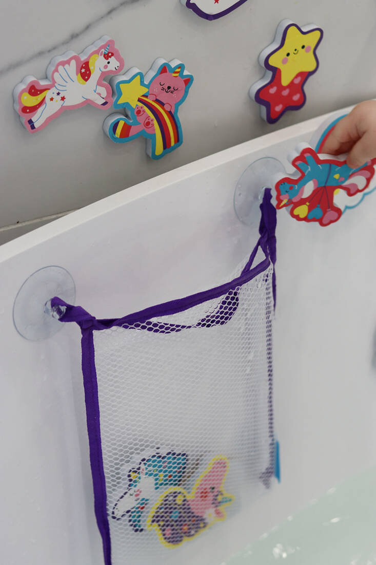 Автор узоров — французская художница и автор книг Клементина Дероди. Игрушка упакована в эстетичную, быстросохнущую сетку с присосками, в которой легко хранить ее элементы. Идеально подходит для подарка.