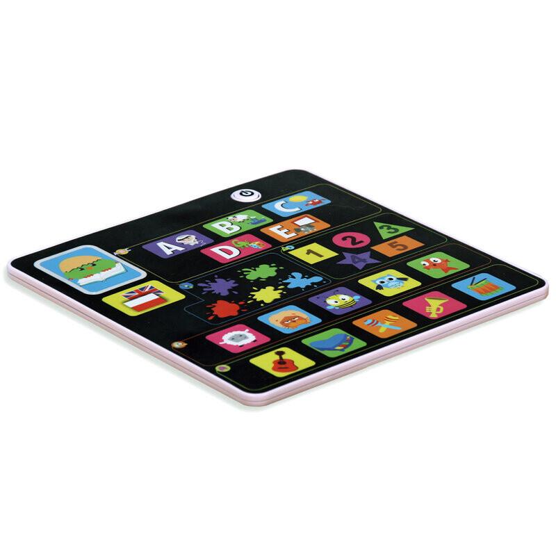 На сенсорной панели планшета 5 картинок с животными, 5 картинок с инструментами, 5 картинок разных цветов, 5 разных фигур с цифрами, 5 картинок с буквами. возможность смены языка и опция, включающая викторину с вопросами для ребенка.