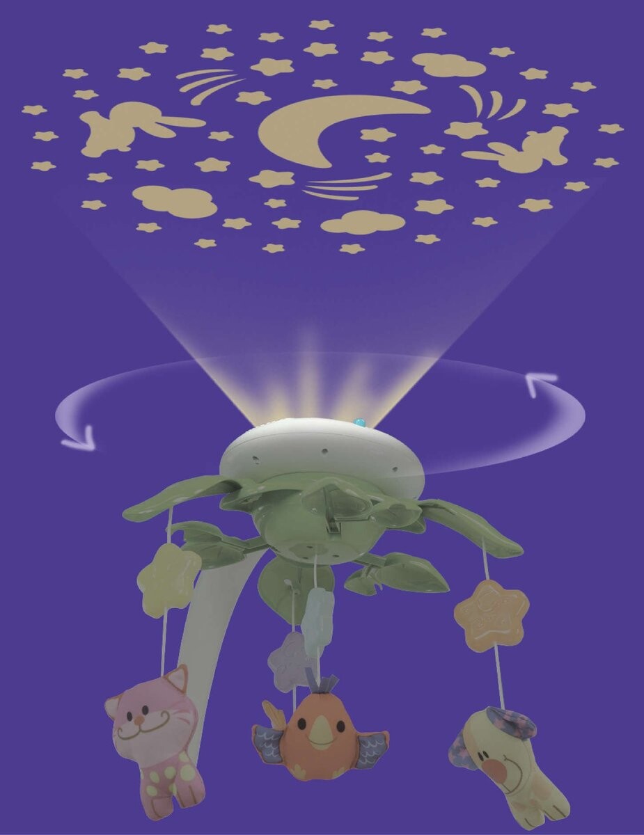 Игрушка крепится на кроватку ребенка, чтобы помочь ему заснуть под успокаивающие звуки. нежные огни и движущиеся животные.