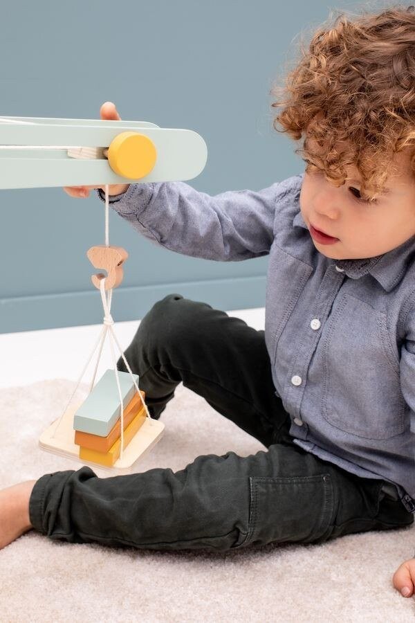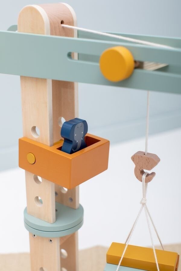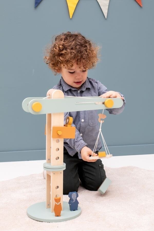 Замечательный деревянный строительный кран, гарантирующий много часов удовольствия! В набор входит кран с погрузочной платформой, три веселых зверька: Лев, Слон и Лисица, а также разноцветные кубики. Блоки, загруженные на платформу, можно поднимать, перемещать вперед, назад и вращать. Игра с журавлем побуждает детей к творческой игре, развивает воображение, мануальные навыки и зрительно-моторную координацию. Более того, он стимулирует природное любопытство и учит решать задачи.
