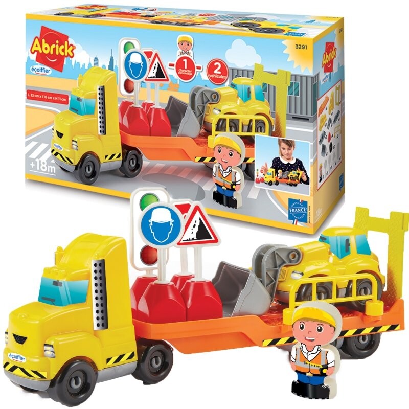 Присоединяйтесь к веселью и играм на стройке! С этим великолепным набором Abrick от Ecoiffier дети могут отправиться работать на стройку, ведь в набор входит большой строительный грузовик с откидной задней дверью, колесный погрузчик, четыре дорожных знака, два барьера и игровая фигурка. форма строителя. Колесный погрузчик можно переносить и транспортировать на грузовике через заднюю дверь.