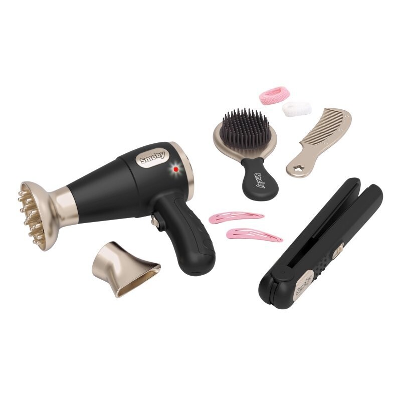 Набор юного парикмахера из 10 аксессуаров. Сушилка размером 14x12,5 см оснащена подсветкой и звуком. В комплект входят 2 батарейки типа ААА 1,5 В (LR03) (не входят в комплект). С этим набором ребенок сможет сыграть роль парикмахера.