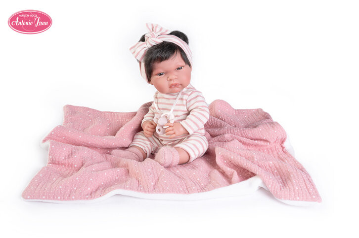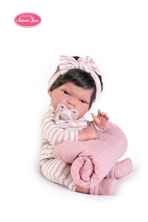 Antonio Juan — испанская компания, специализирующаяся на производстве кукол, которые выглядят и чувствуют себя как настоящие дети. Куклы Антонио Хуан – это гарантия отличного качества изготовления. Они на 100% сделаны вручную в Испании. Тонета — малышка с реалистичным выражением лица и идеальным размером, которая будет сопровождать вас, куда бы вы ни пошли. Тонета лежит на одеяле и любит, когда вы расчесываете ее красивые каштановые волосы и надеваете повязку на голову, соответствующую ее одежде. В комплект входят: кукла, повязка на голову, соска, футболка, носки, носки и одеяло.