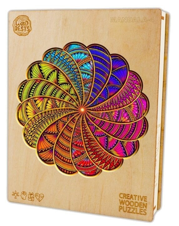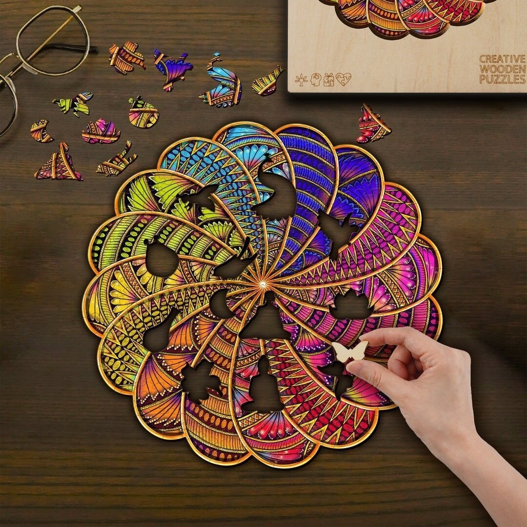 Набор деревянных пазлов на который не распространяются классические правила решения - у пазлов нет углов ни классические концовки. Их оригинальность заключается в форме рисунка – при расстановке возникает силуэт красочной мандалы.