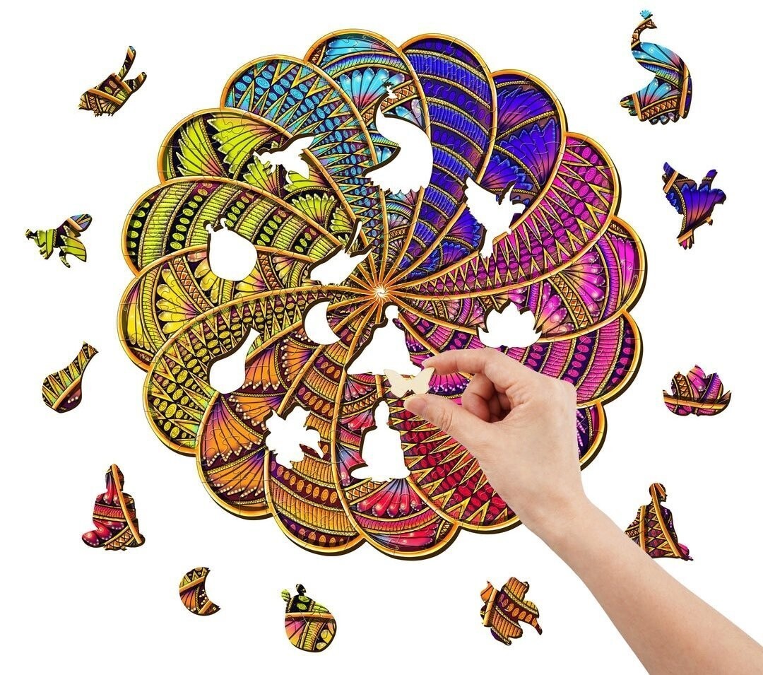 Набор деревянных пазлов на который не распространяются классические правила решения - у пазлов нет углов ни классические концовки. Их оригинальность заключается в форме рисунка – при расстановке возникает силуэт красочной мандалы.