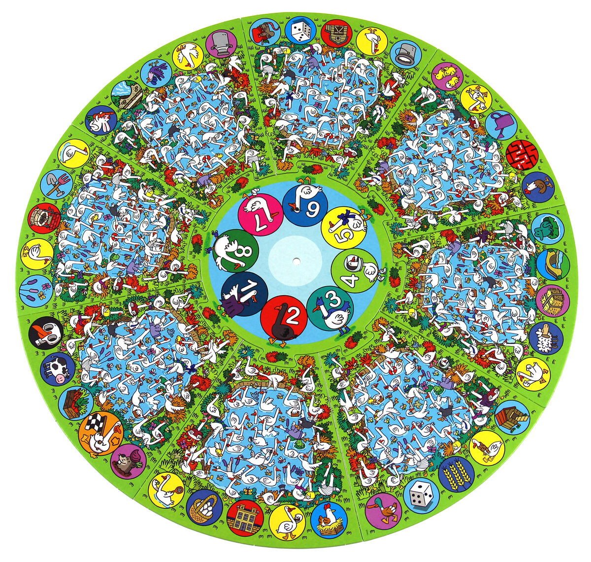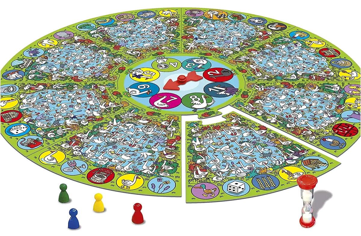 3, 2, 1… Вперёд! — серия быстрых игр для детей. На модульной доске вы встретите титульных гусей, но они не такие уж и обычные... Некоторые из них носят солнцезащитные очки, шлемы космонавтов или катаются на роликовых коньках! Стрелка в центре доски указывает, какого гуся ищут. Кто окажется самым наблюдательным и заметит это первым? Эта игра имеет два варианта. В ходе игры каждый по очереди поворачивает стрелку, указывающую на искомого гуся, и ищет его. Если ему это удается, в течение срока, установленного песочными часами, он перемещает свою пешку по шкале очков. Если песок в песочных часах закончился, а игрок так и не нашел искомого гуся, в игру вступают другие игроки! Первый, кто заметит нужного гуся, получит баллы. Во втором варианте гусей ищут все одновременно! Если игрок первым заметит правильного гуся, он получит указанное количество очков. сколько это указывает? Если он также найдет еще один такой же, он получит двойные баллы. Однако вам нужно быть осторожным, поскольку дорожка подсчета очков скрывает специальные места. Игроки должны тщательно обдумать, стоит ли искать гуся, ведь если они найдут череп, им придется вернуться в начало! Есть также полезные квадраты, такие как гусь, который переносит игрока на следующий квадрат с гусем. СОДЕРЖАНИЕ: доска с подсказкой, 4 пешки, песочные часы и инструкции.