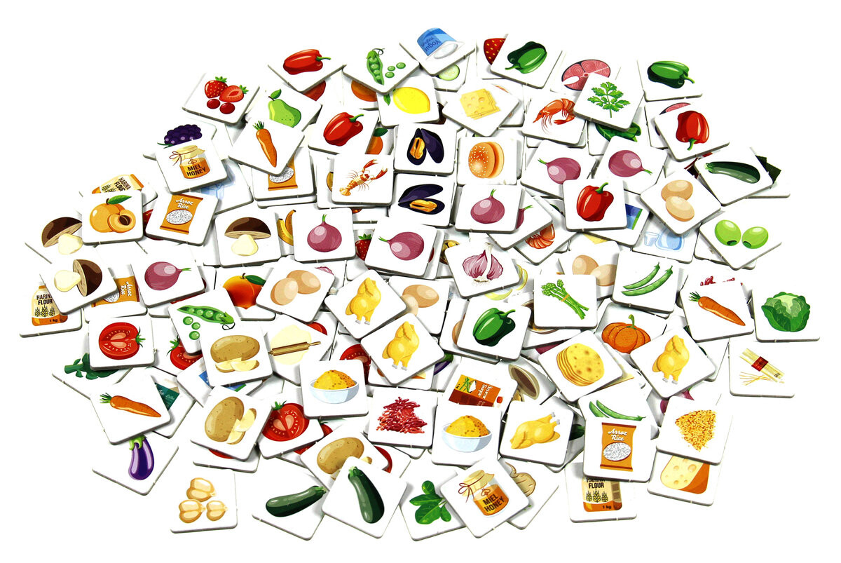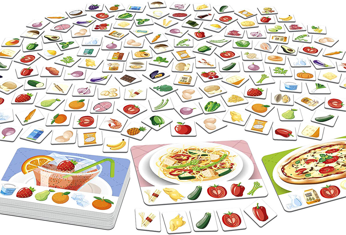 Третий вариант — из вкладки меню. В этом варианте меню разделено на закуски, основные блюда и десерты. Сначала все игроки собирают ингредиенты выбранной закуски, как только они это делают, они тянут карту основного блюда и быстро ищут его ингредиенты, когда основное блюдо готово, они тянут карту десерта.