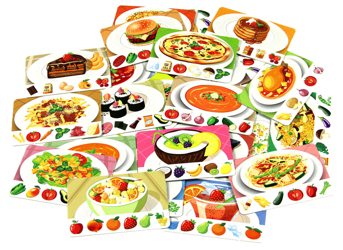 После того, как полноценный обед закончен, они снова возвращаются к картам закусок и так далее, пока из одной из стопок не удастся вытащить карту. Каждый игрок подсчитывает, сколько блюд ему удалось приготовить, и дополнительно добавляет по одному баллу за каждый комплект. Побеждает тот, у кого больше всего очков. СОДЕРЖАНИЕ: 24 блюда, 150 ингредиентов, инструкция