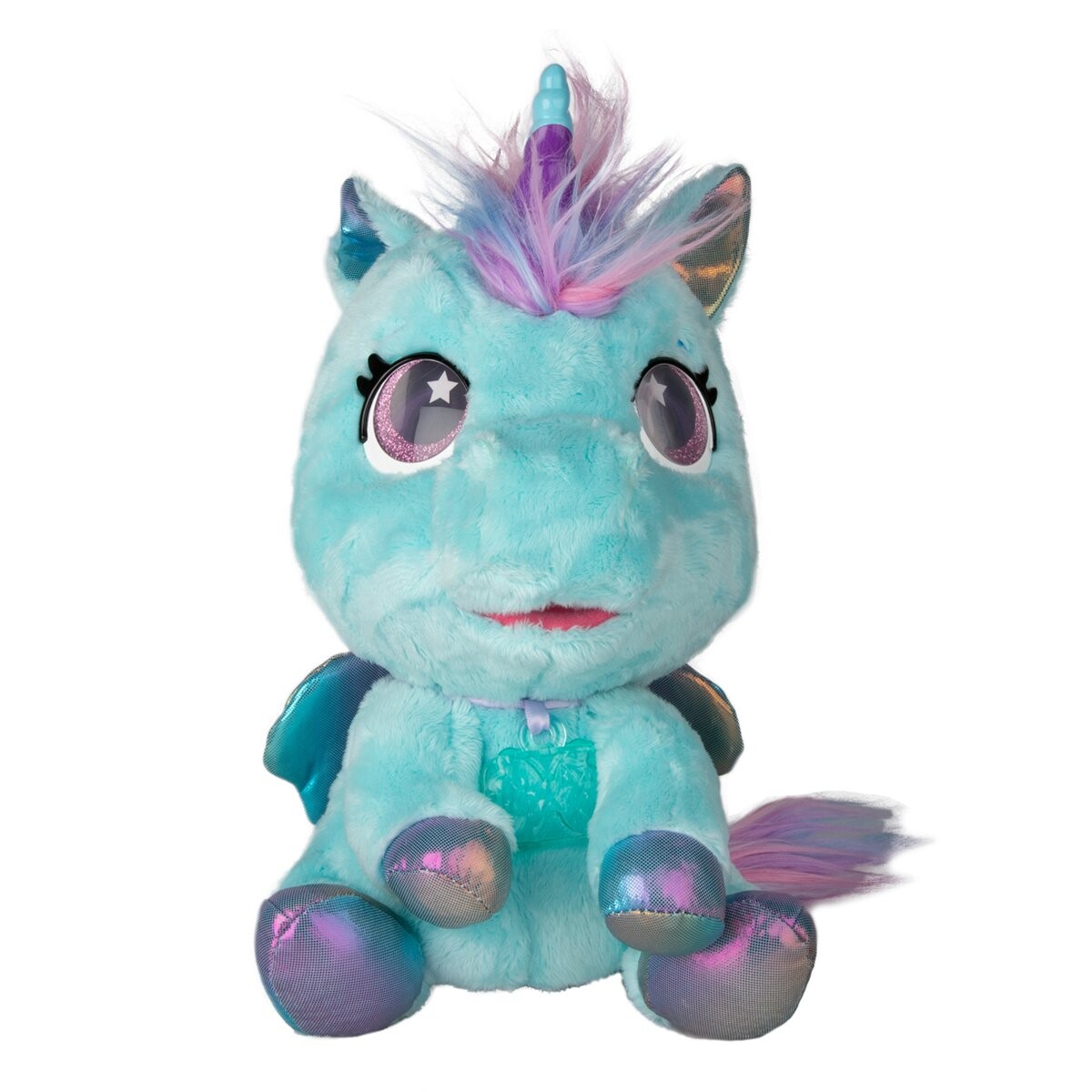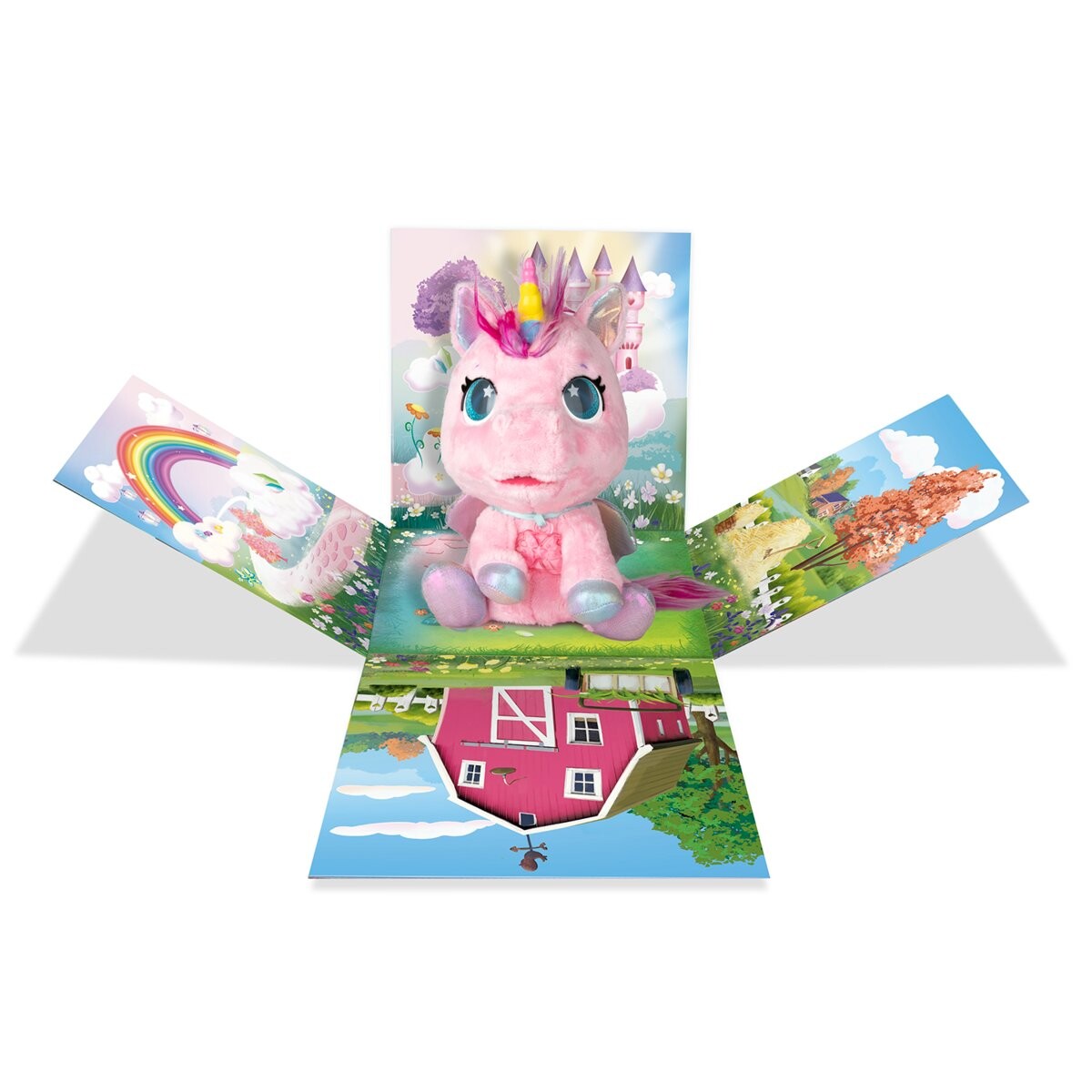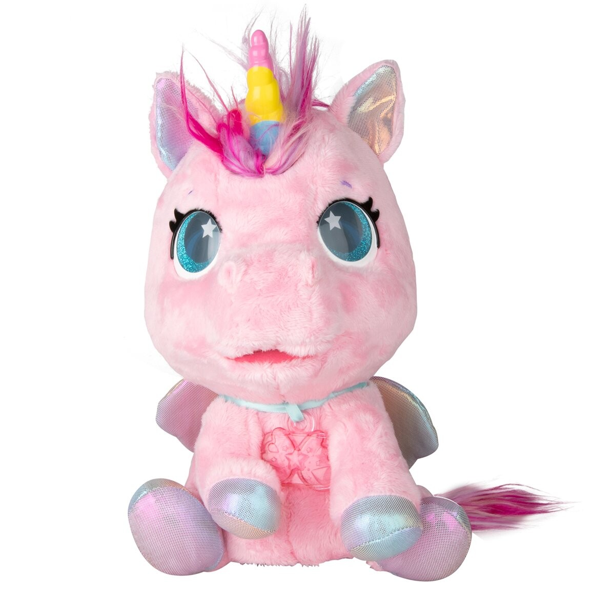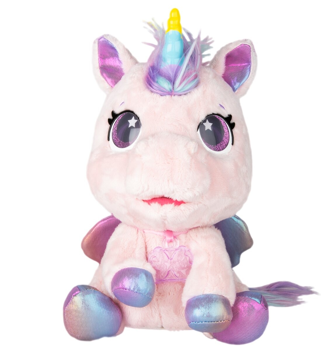 Его цвет — сюрприз! Он доступен в трех цветовых вариантах: светло-розовом, розовом и синем. Его рог растет на трех уровнях, но только при правильном уходе. Вам нужно погладить пони и покормить его радужным молоком, и он ответит волшебными звуками. Если вы хотите завершить трансформацию, просто прикрепите к нему крылья и он запоет мелодию. Весь процесс превращения пони в единорога обратим. Позаботьтесь о нем, дайте ему имя и заполните свидетельство об усыновлении. и он станет лучшим другом вашего ребенка.