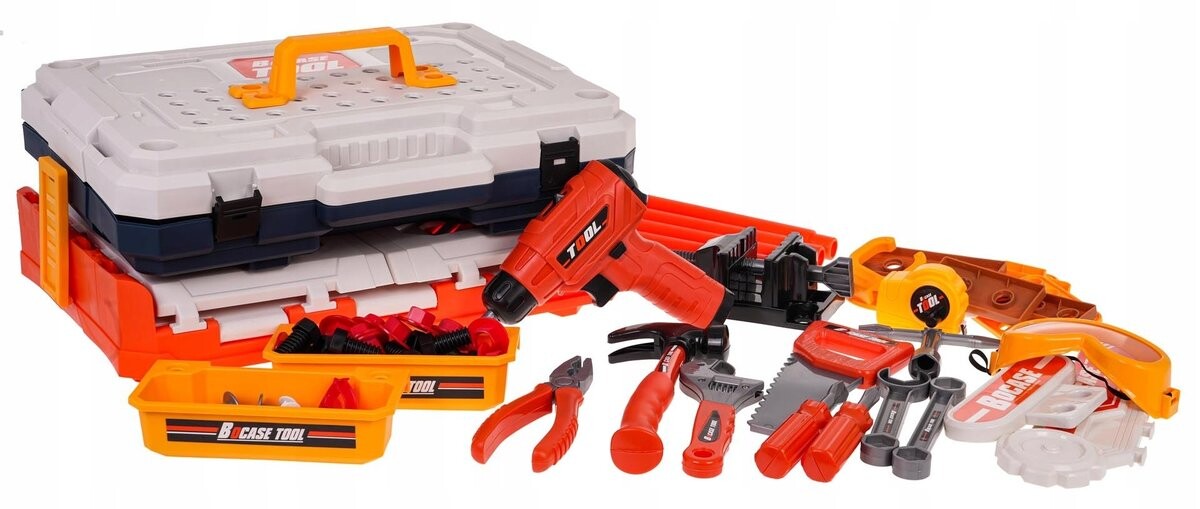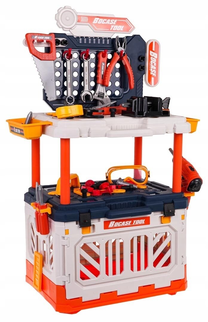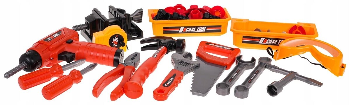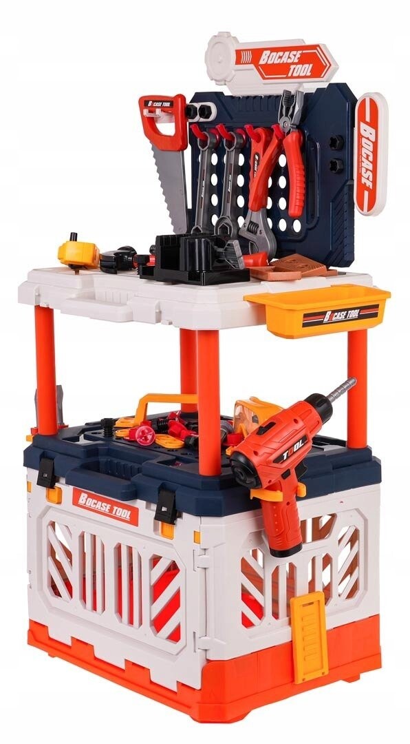 Маленький набор «Сделай сам» 4-в-1 с интерактивной дрелью и отверткой для детей от 3 лет. Набор изготовлен из высококачественного пластика. В набор входит целых 90 элементов. Из строительных частей мастерской можно создать ящик для инструментов, переносной чемодан, стоячий верстак и небольшой столик для инструментов. Дрель-шуруповерт питается от 2 батареек типа АА 1,5 В (не входят в комплект), имеет сменные насадки, а также звуковые и световые эффекты. Тиски можно перемещать вручную. Набор развивает зрительно-моторную координацию и доставит массу удовольствия маленькому любителю DIY.