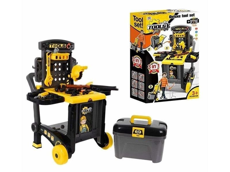 Вся игрушка помещается в удобную коляску, которую можно легко взять с собой куда угодно.Столярная мастерская 3 в 1 порадует каждого маленького любителя рукоделия! Качество и безопасность