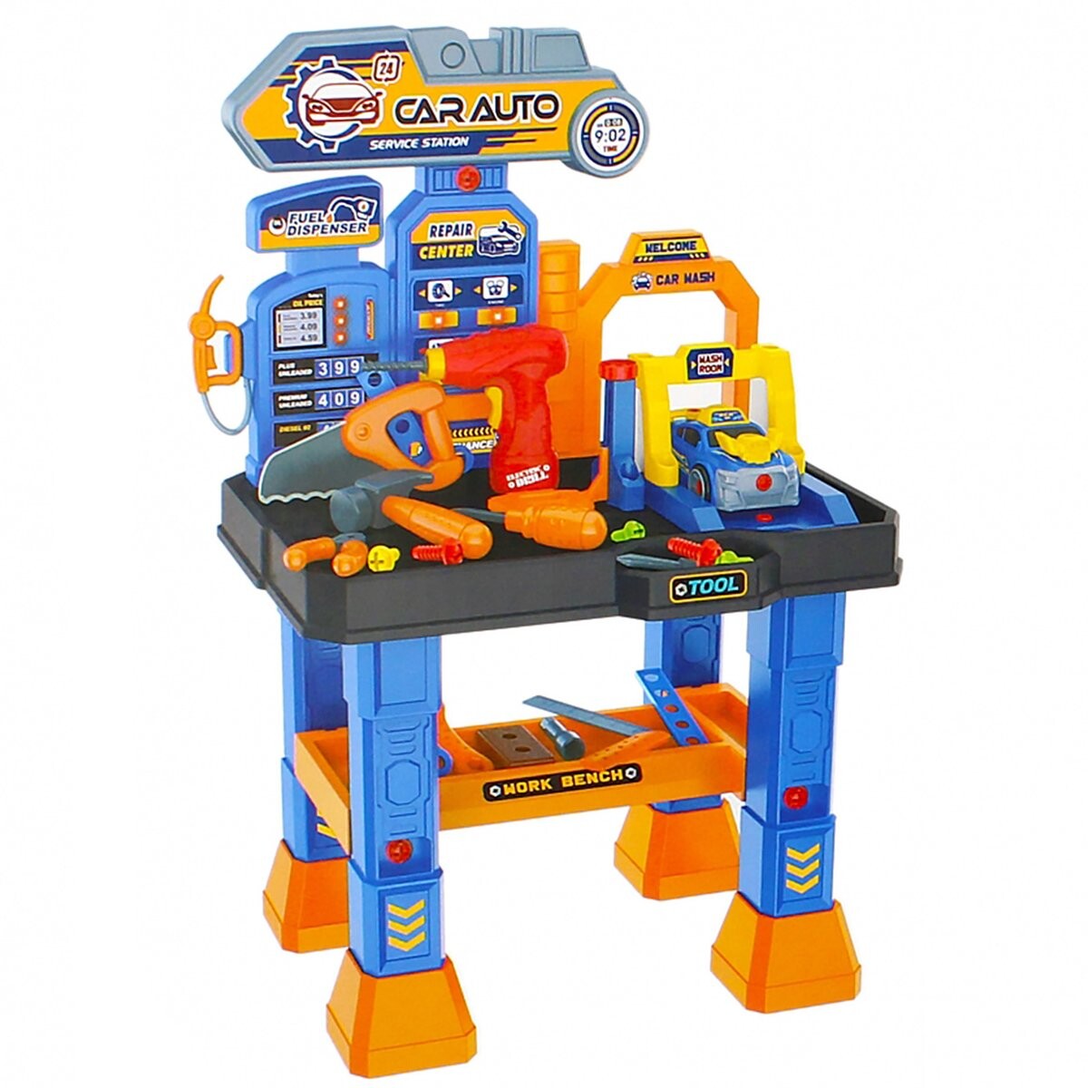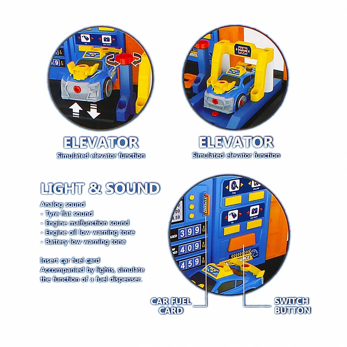 В мастерской есть своя заправка, лифт, небольшой гоночный автомобиль и звуковые эффекты, т.е. звук отвертки и вкручиваемых шурупов.