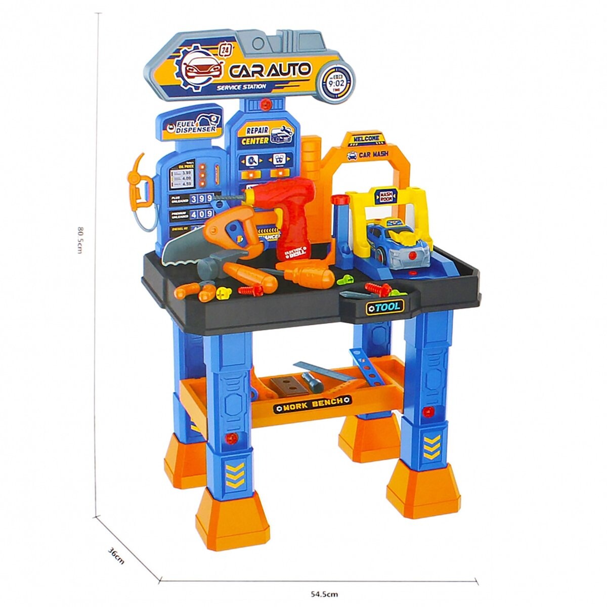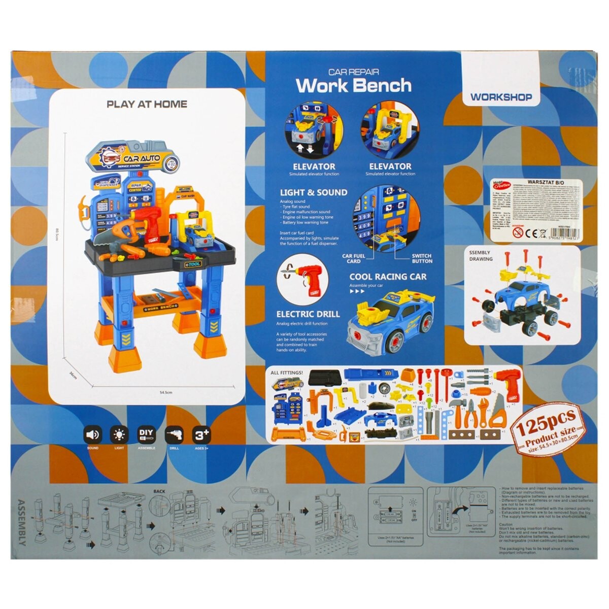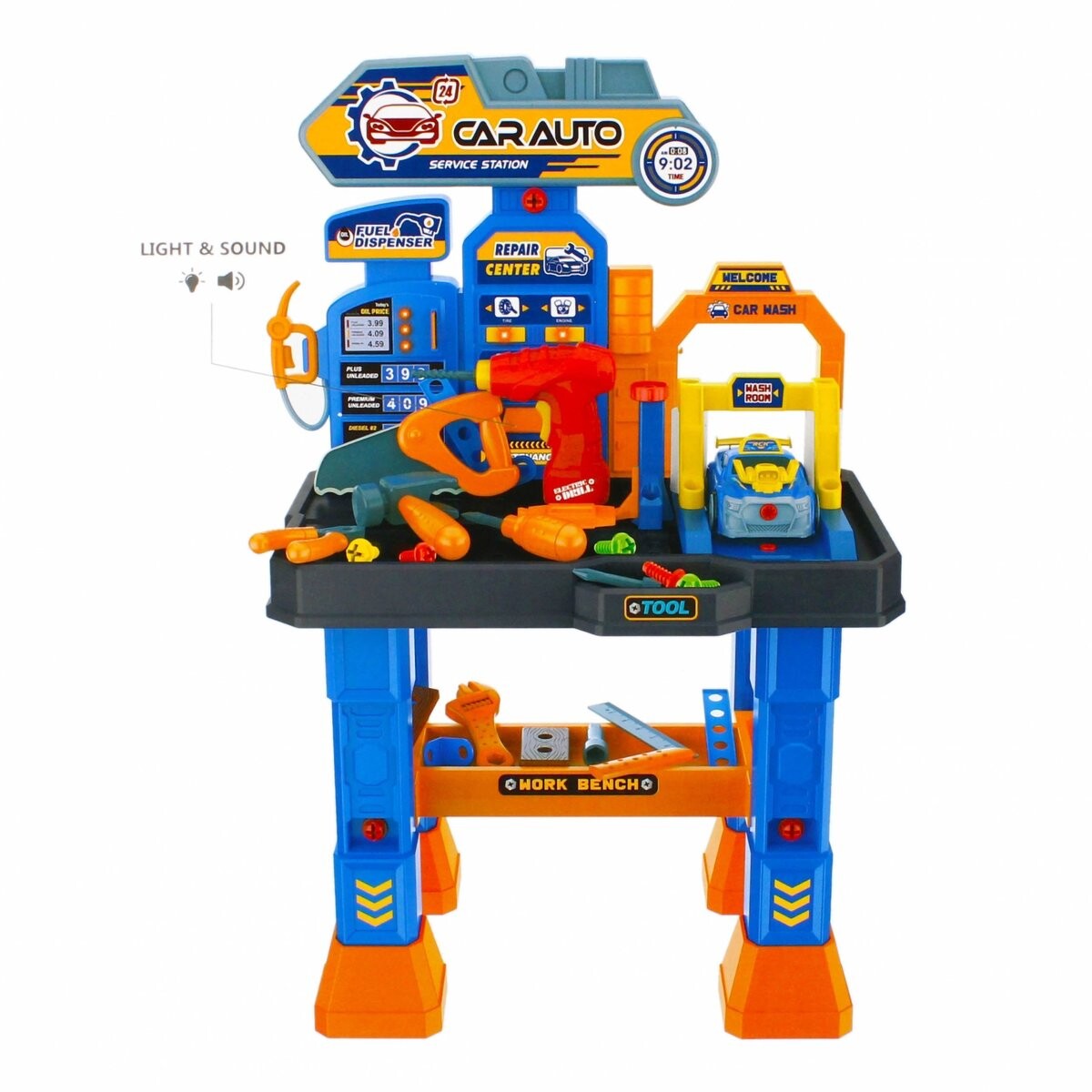 В мастерской есть световые и звуковые эффекты, ребенок может изучить возможности и функциональность простых инструментов, игрушка развивает мануальные навыки и пространственное мышление.