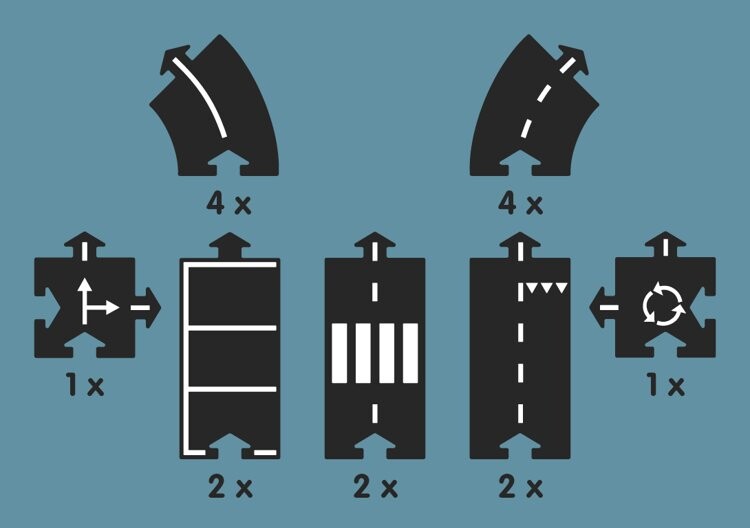 Шоссе содержит 16 элементов:8 поворотов, 6 прямых, 2 перекрестка