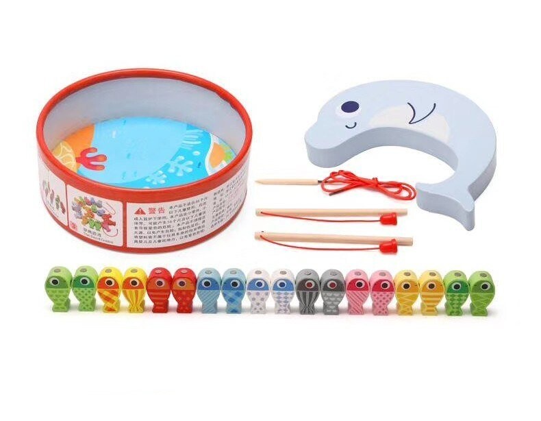 Игрушка позволяет играть более чем одному человеку. В комплект входит балансирующий дельфин, коробочка (аквариумные рыбки), 18 рыбок (бусины), две удочки и веревка для нанизывания бус. все упаковано в красивую коробку