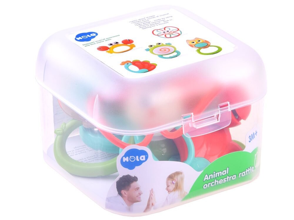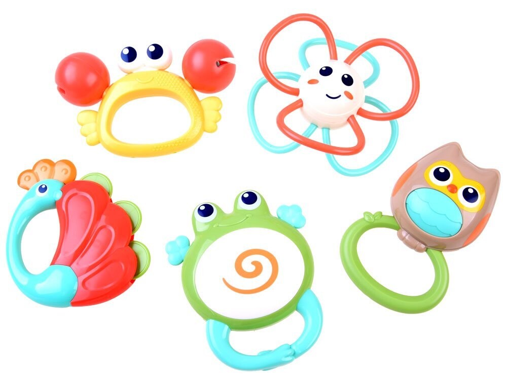 Набор из 5 разноцветных погремушек — предложение для самых маленьких, которые познают мир. Набор изготовлен из пластика с выступами различной текстуры, который идеально подходит, например, для прорезывания зубов, а также для игр. Когда погремушку трясут, она гремит. Игрушки, предназначенные для детей с раннего возраста, стимулируют хватательный рефлекс, способствуют изучению форм, поддерживают развитие мелкой моторики, тренируют зрительно-моторную координацию и поддерживают сенсорное развитие ребенка благодаря различным цветам и формам. Игрушки выполнены в очень красивых, эстетичных цветах, привлекают внимание и побуждают к игре. Игрушка прекрасно стимулирует чувства и развивает воображение. обеспечивая ребенку интересное занятие на долгое время.