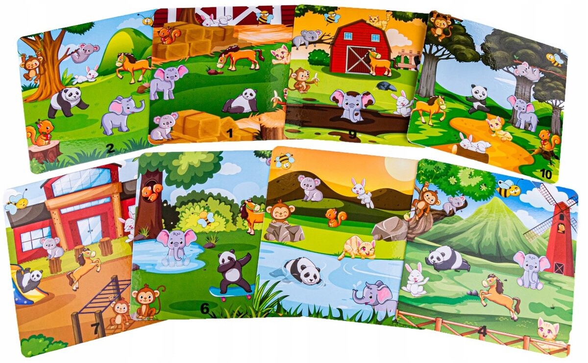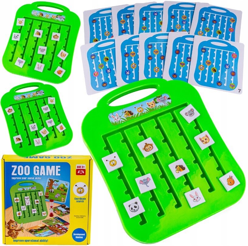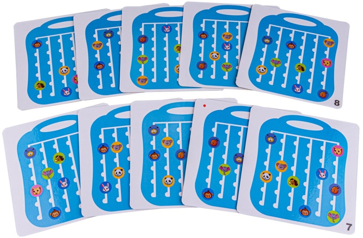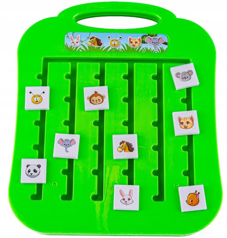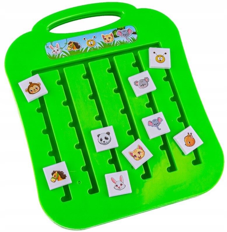 Задача ребенка – расположить животных на доске так, как на нарисованной карточке. Все не так просто – животные могут блокировать друг друга. Для повышения уровня сложности можно вовремя определить решение задачи.