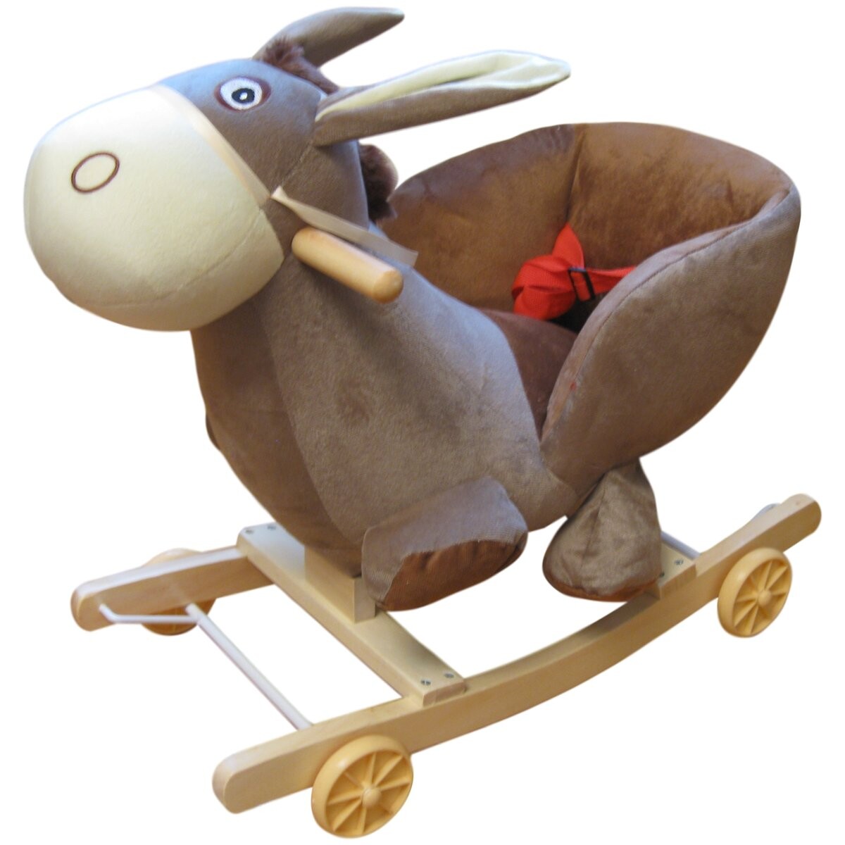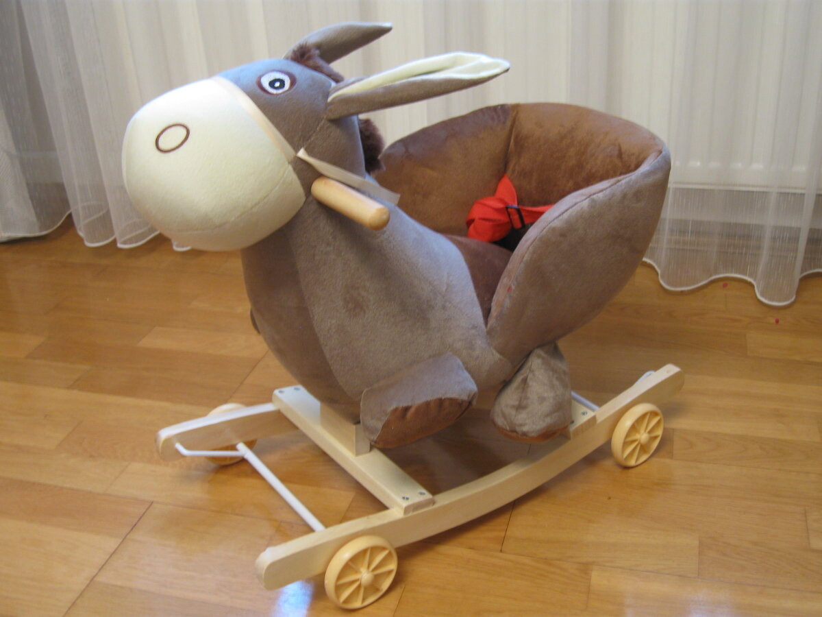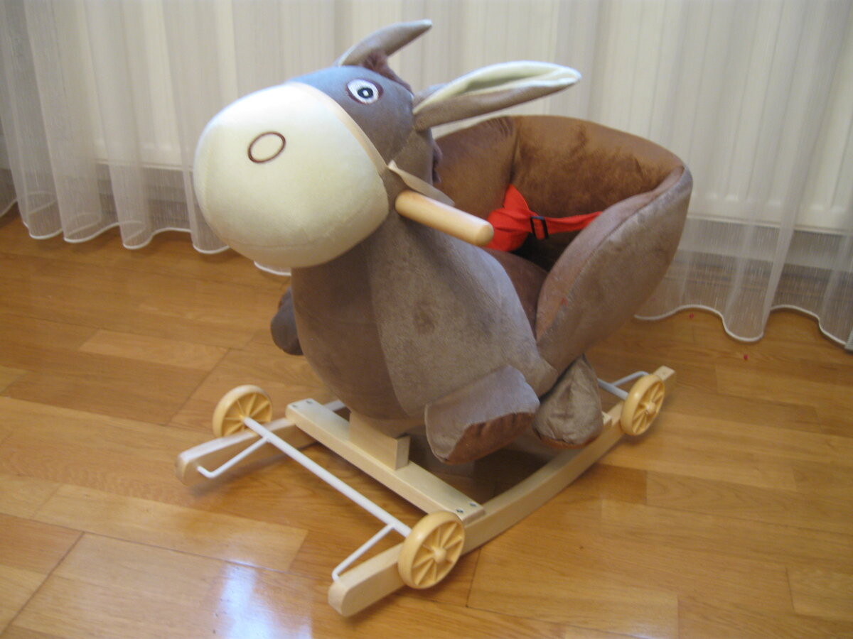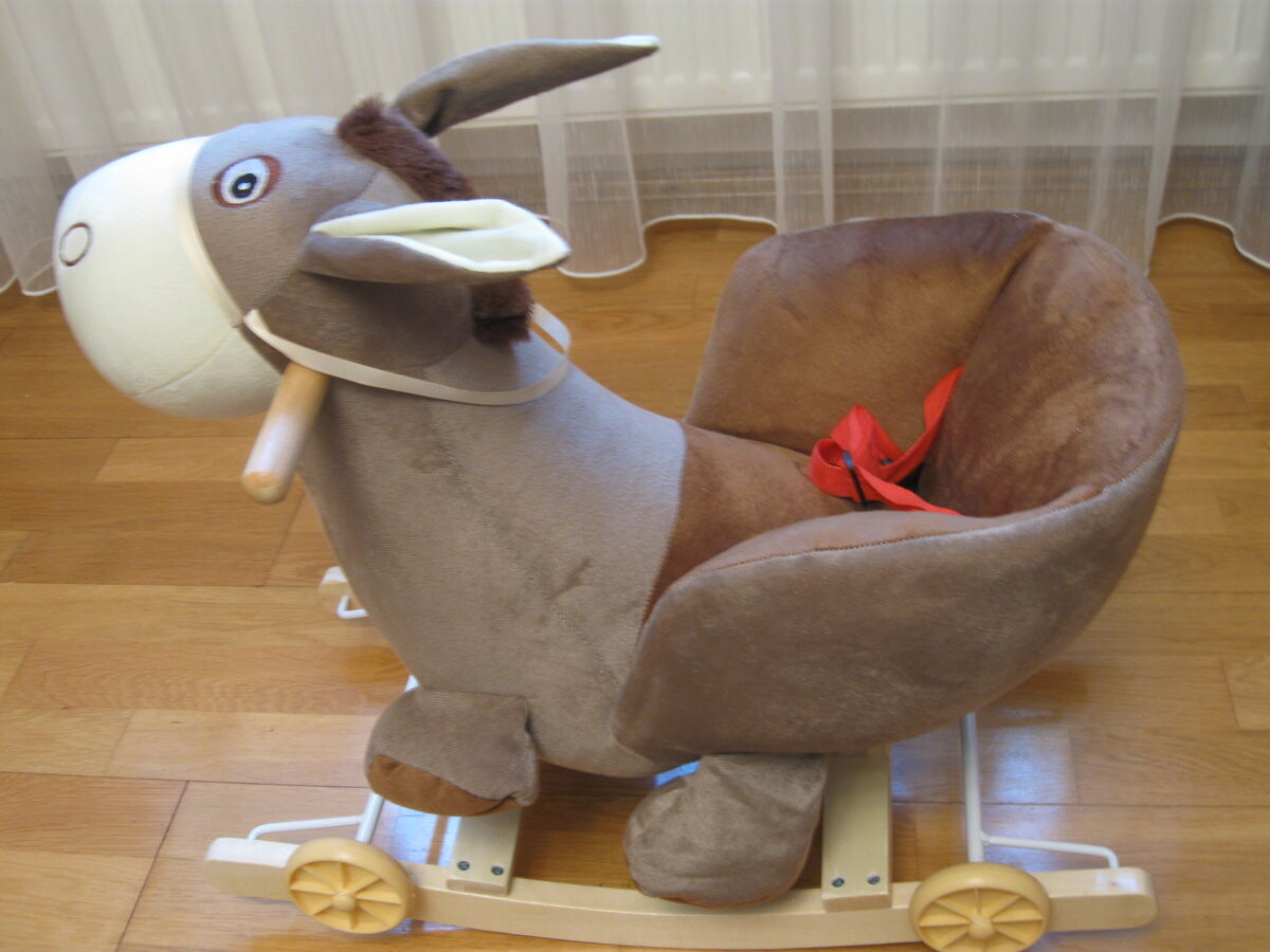 Игрушка изготовлена ​​из мягкого и приятного на ощупь плюша. Качалка оснащена колесами, спрятанными на полозьях, поэтому ее можно быстро превратить в удобную коляску.