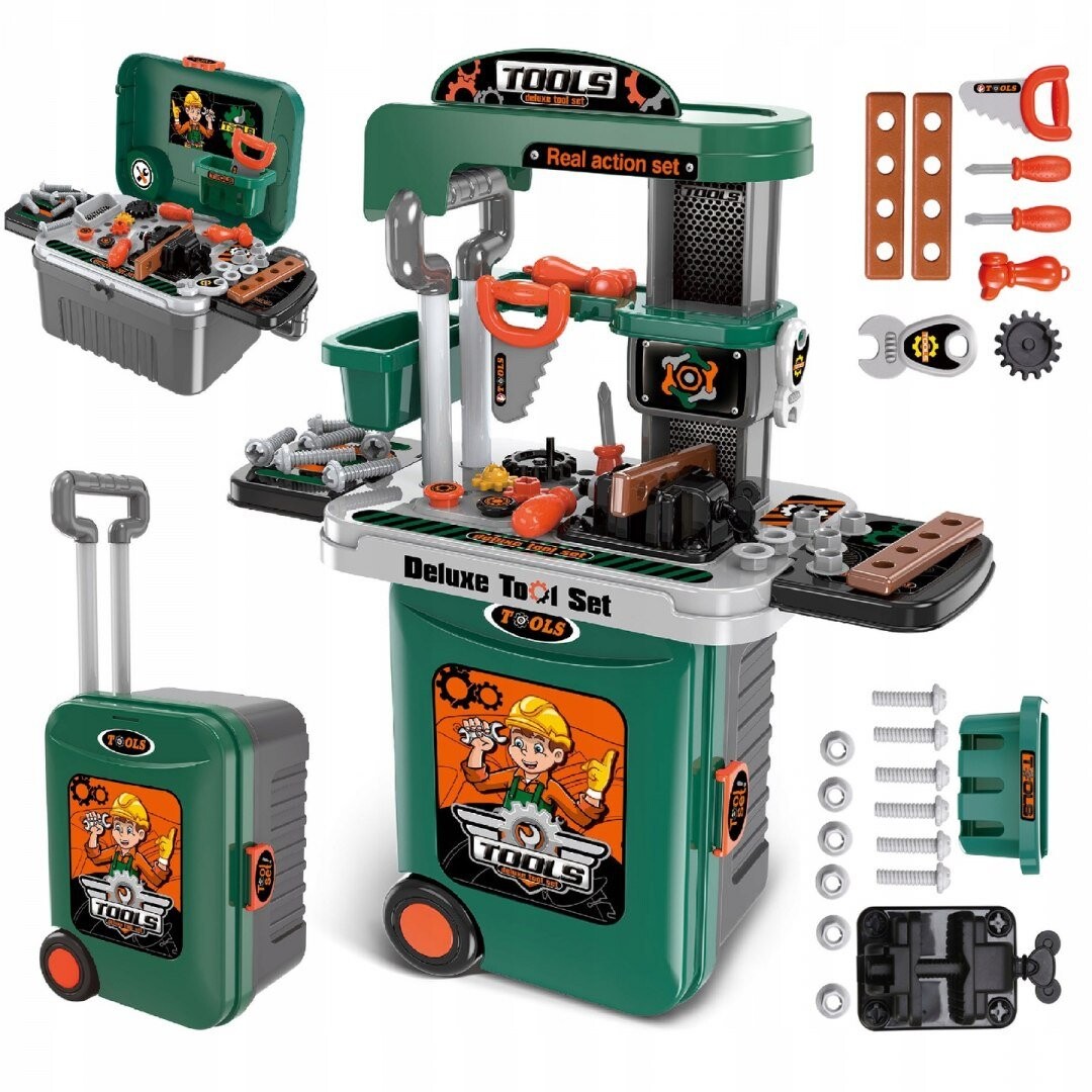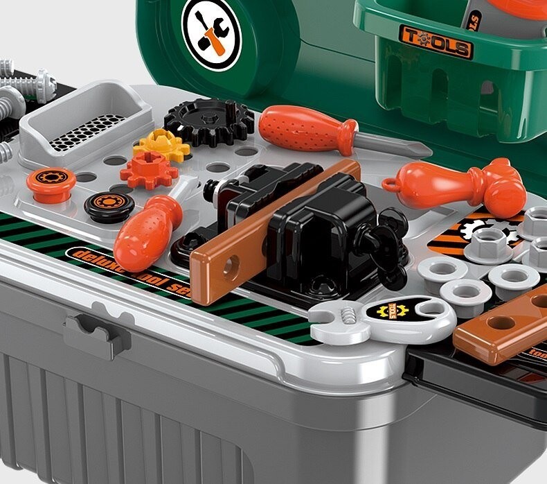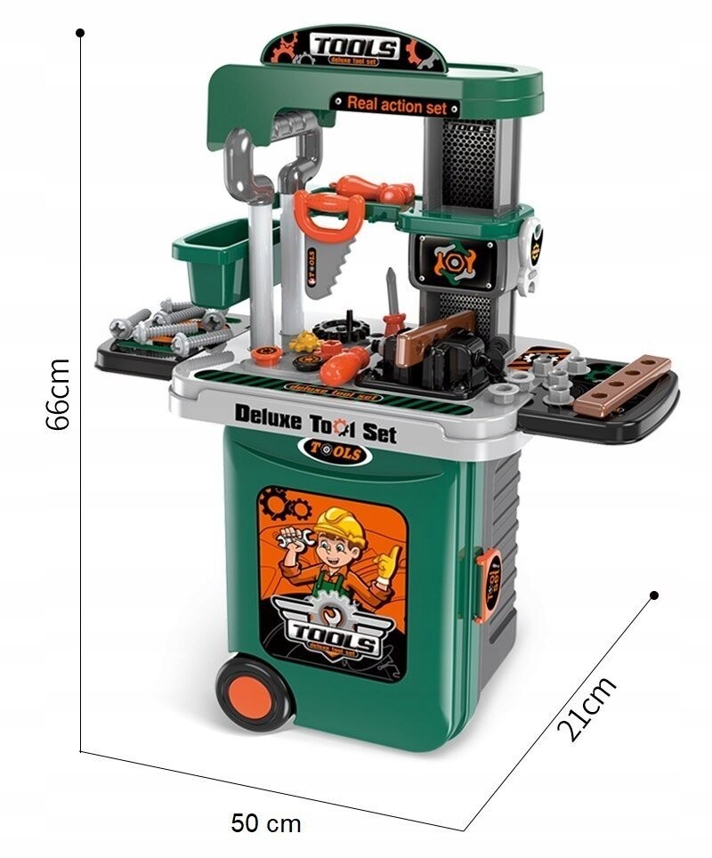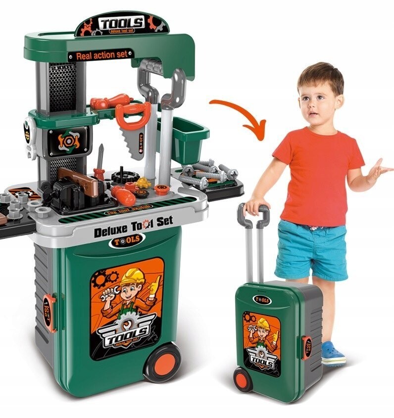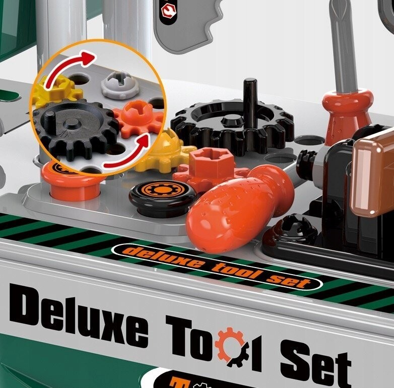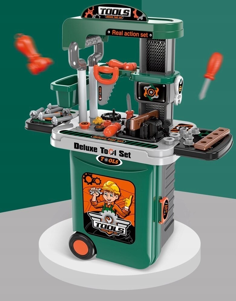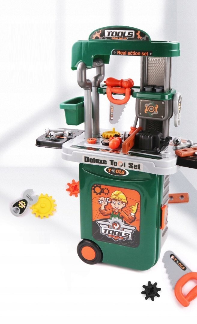 Важнейшая функция — трансформация мастерской в транспортный кейс с выдвижной ручкой . Девочки могут гулять с кукольными колясками, и у нас наконец-то появилась игрушка, которую мальчик может взять на прогулку. Такие инструменты, как: циркулярная пила, винты с гайками и шайбы для их вкручивания, все это доставит удовольствие вашему ребенку на долгое время.