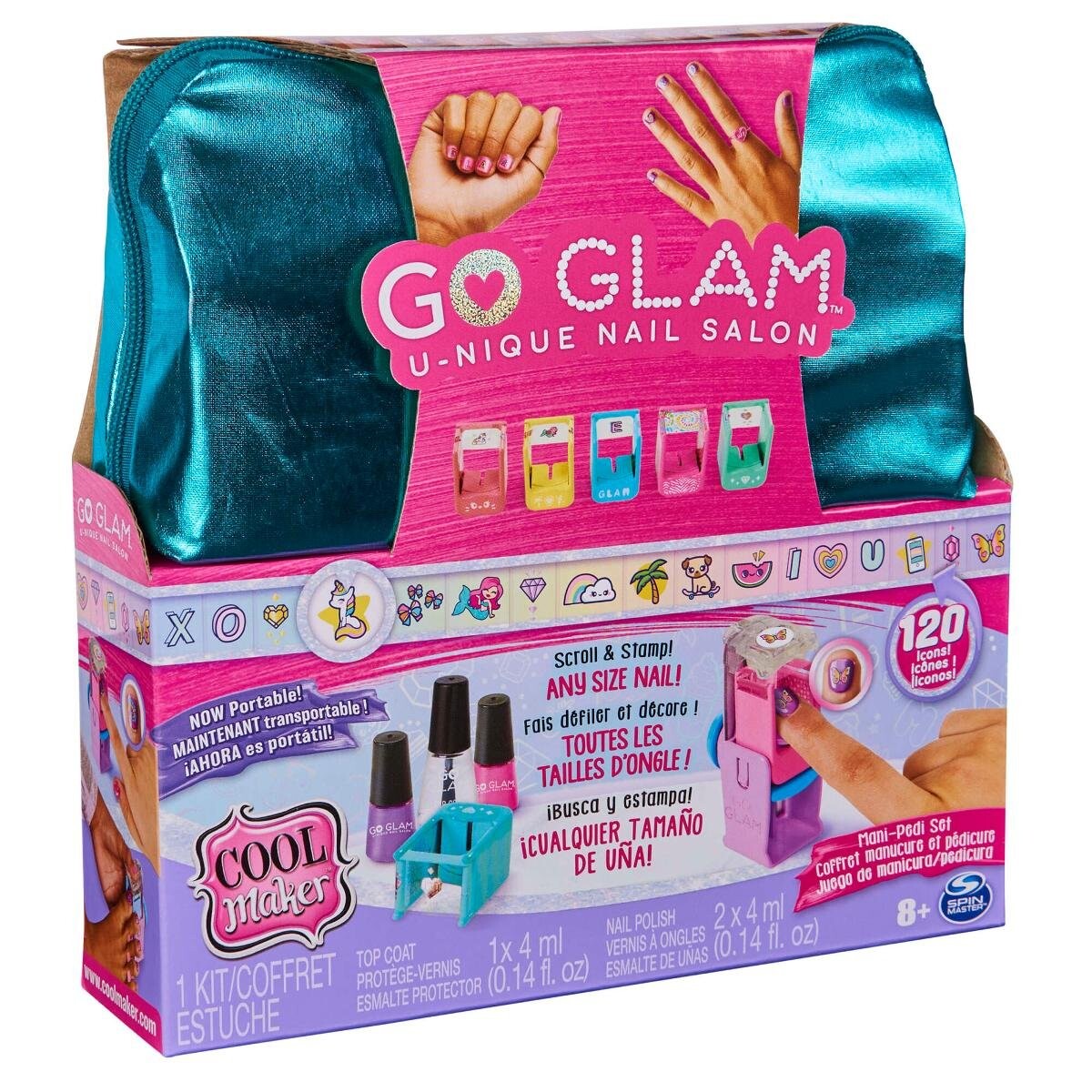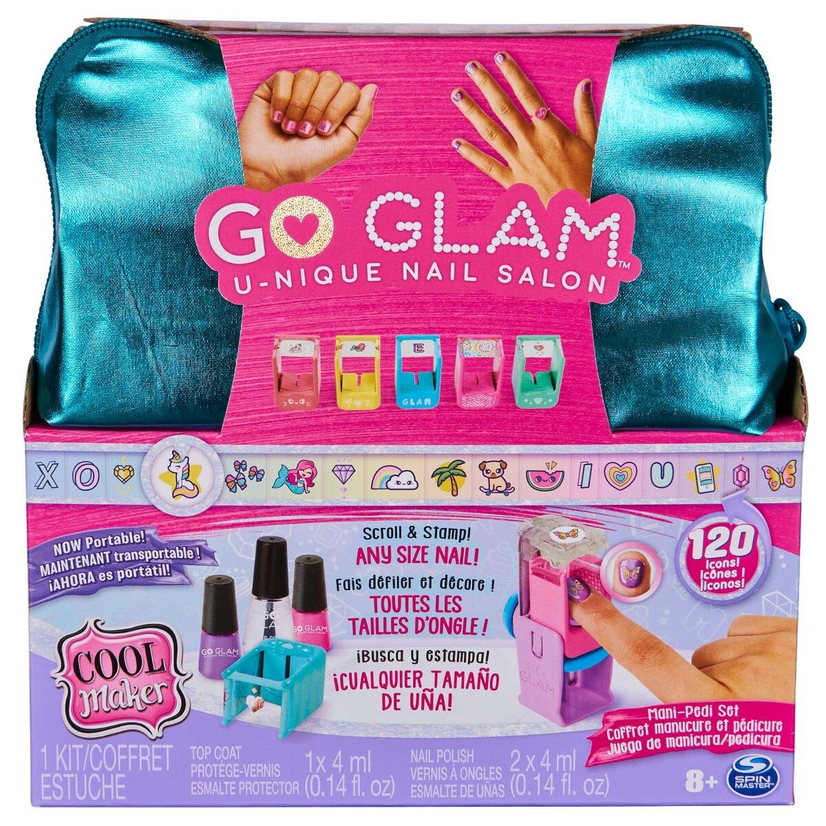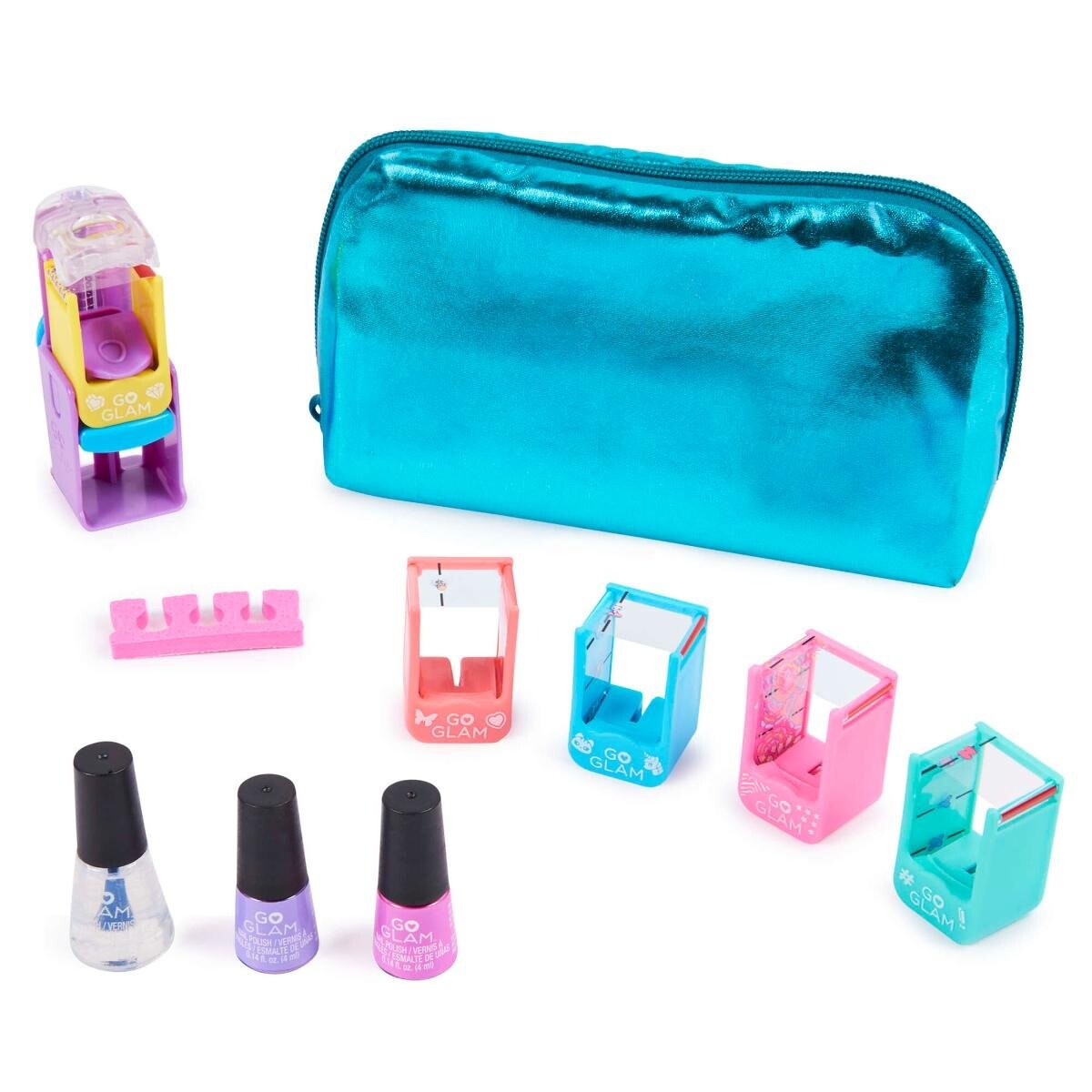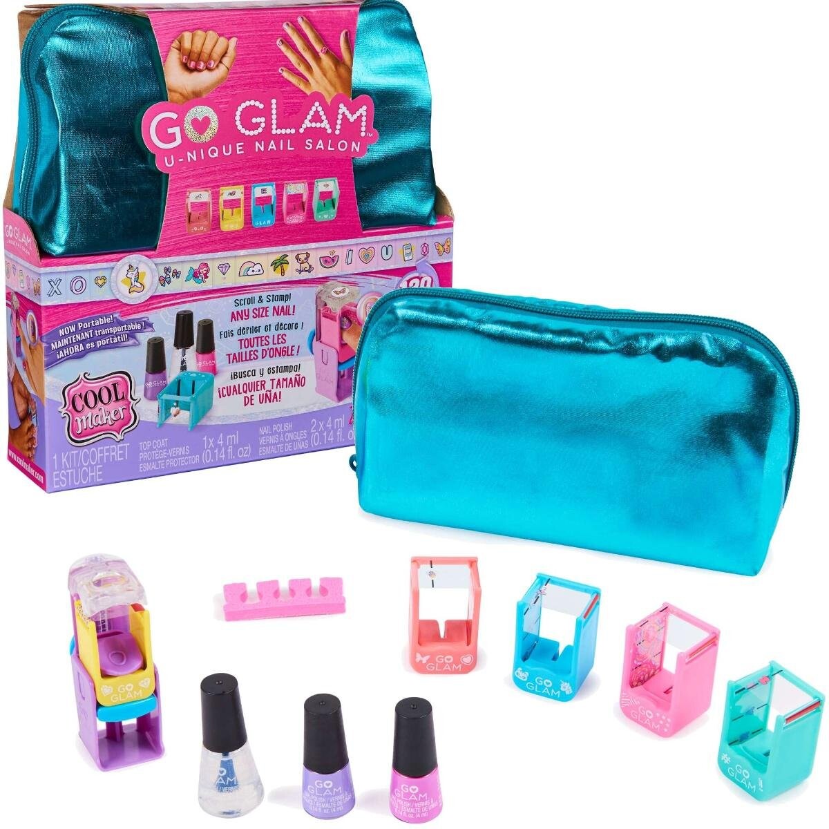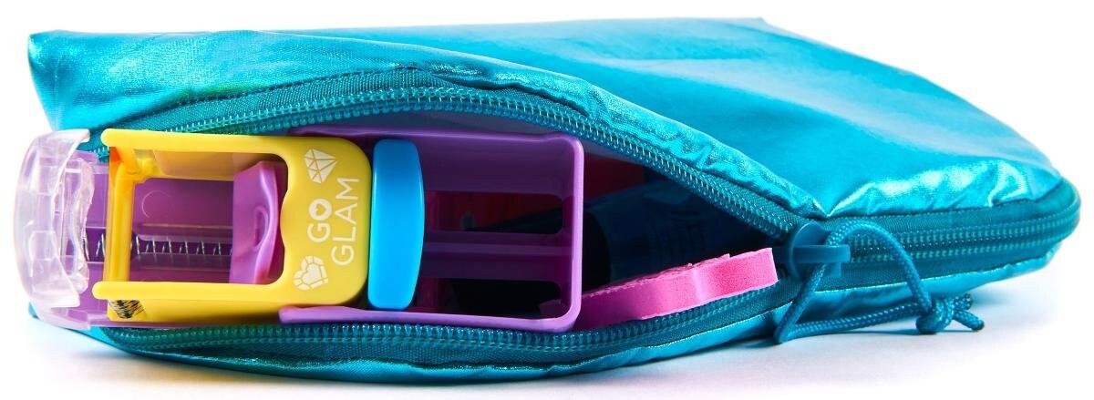 Набор Go Glam Nail U-nique Nail Salon состоит из бирюзовой мерцающей косметички, закрывающейся на молнию, и аксессуаров для создания неповторимых узоров на ногтях.