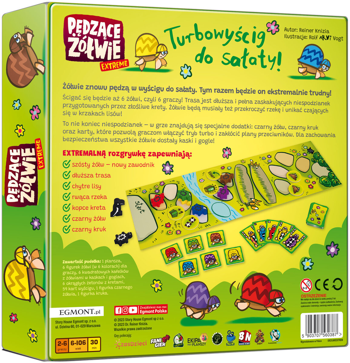 Черепахи снова участвуют в салатной гонке, но на этот раз это будет чрезвычайно сложно. В гонке будут участвовать целых 6 черепах, то есть 6 игроков! Маршрут более длинный и полон неожиданных сюрпризов, подготовленных злобными кротами. Черепахам также придется пересечь реку и избежать встречи с лисой, скрывающейся в кустах!
