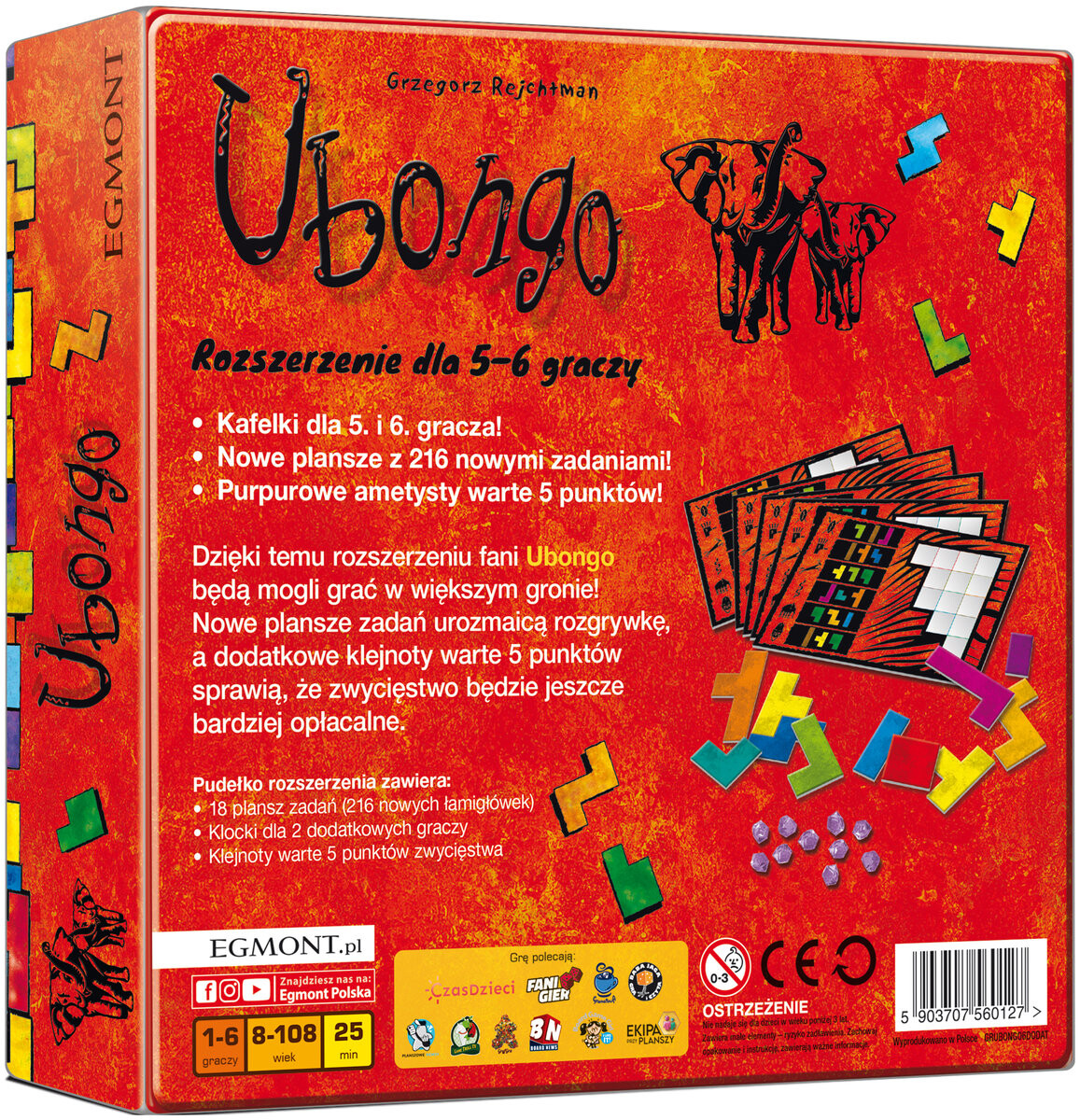 Расширение для 5-6 игроков. Благодаря этому расширению поклонники «Убонго» смогут играть в более крупной группе! Новые доски квестов добавляют разнообразия в игровой процесс, а дополнительные 5-очковые драгоценные камни делают победу еще более полезной. В комплект расширения входят: 18 досок квестов (216 новых головоломок), блоки для 2 дополнительных драгоценных камней игроков, дающих 5 победных очков.