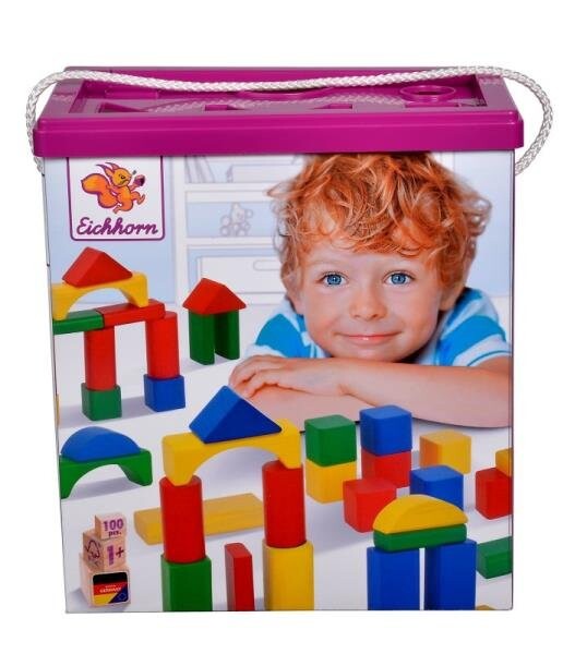 Набор из 100 деревянных разноцветных кубиков различной формы, упакованных в практичное ведро с сортировщиком форм на крышке, FSC 100.