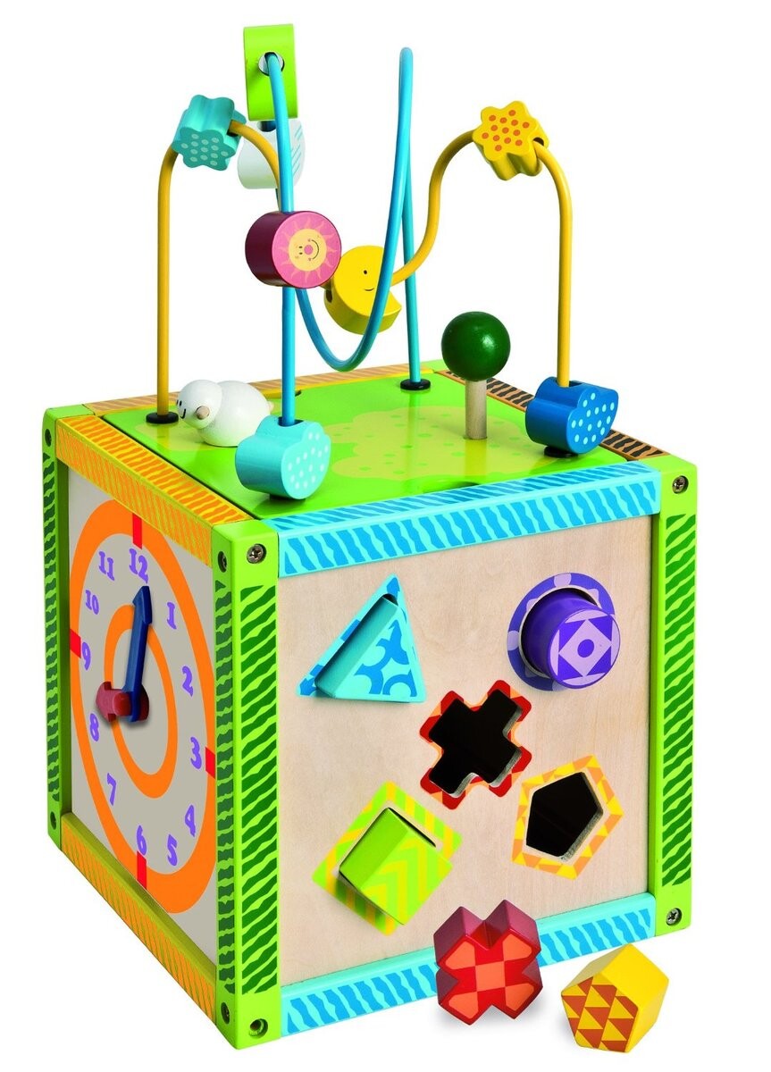 • четыре стороны имеют подвижные элементы разного размера, которые ребенок может перемещать, вращать или корректировать форму, таким образом развиваем зрительную координацию - движения и физическую подготовку