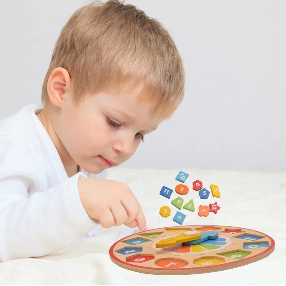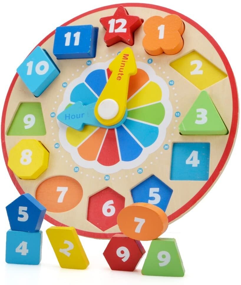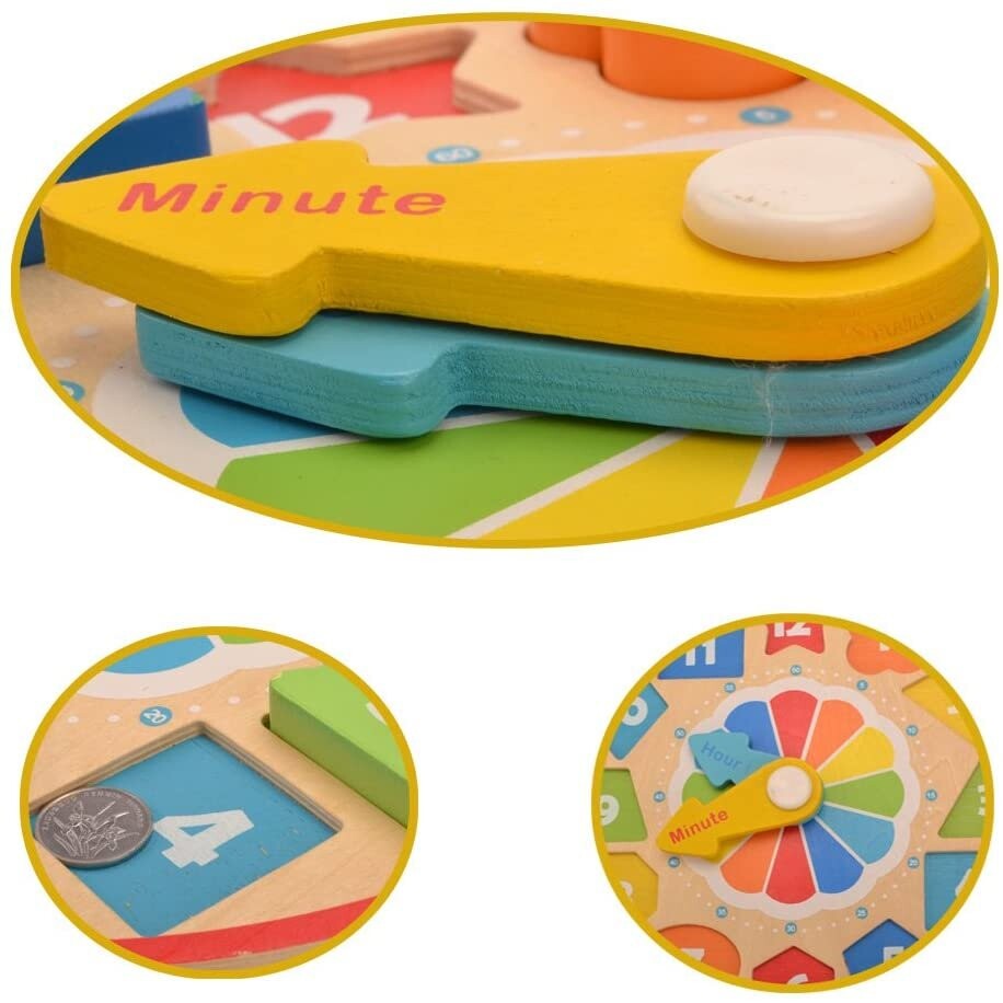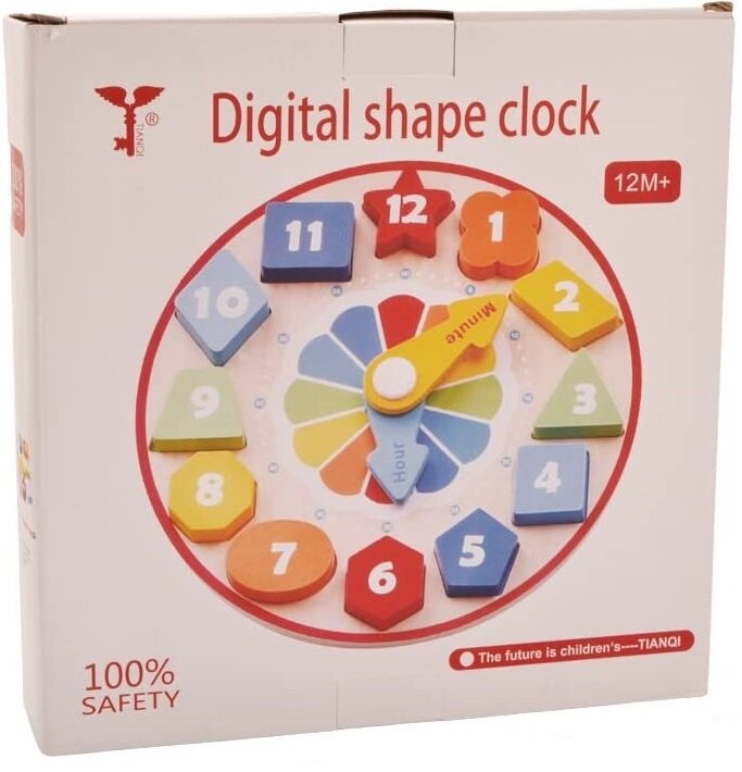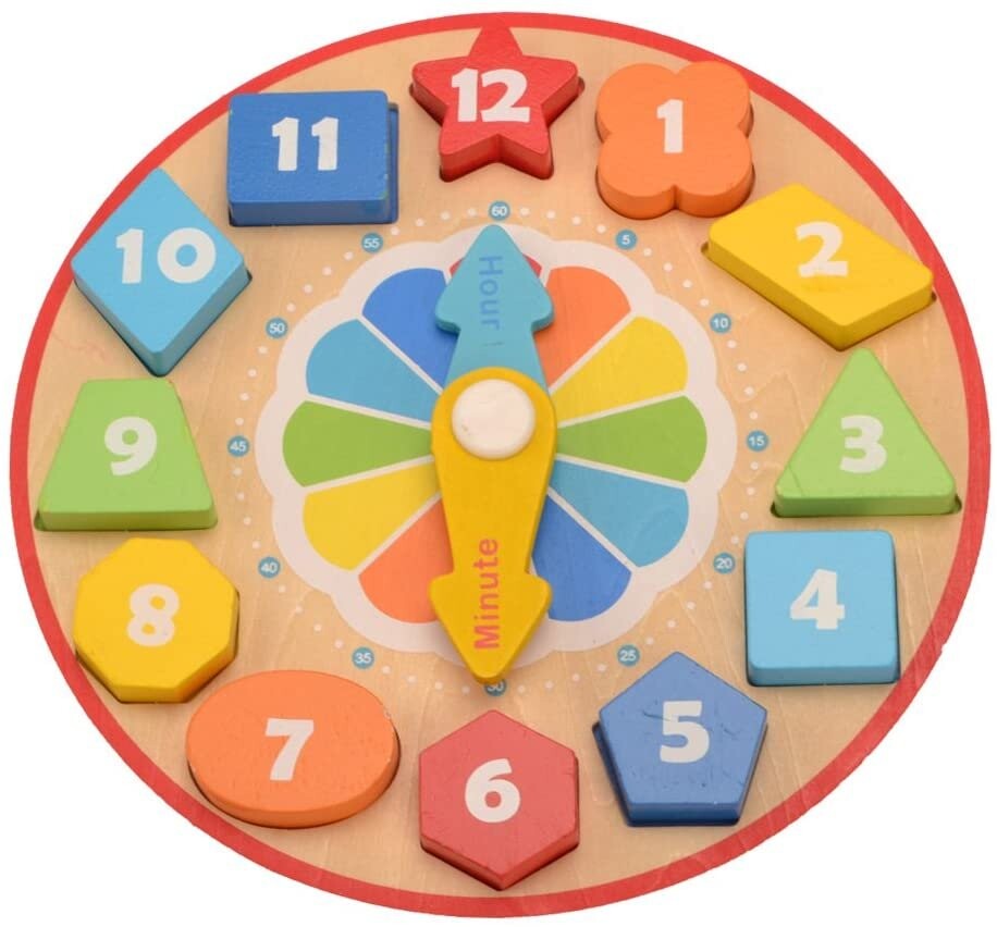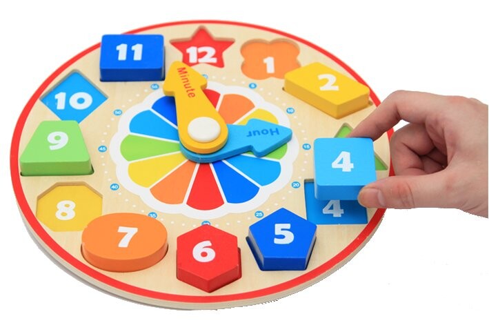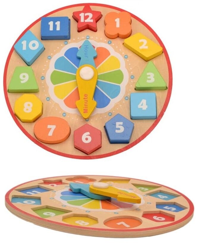 Деревянная игрушка, которая сочетает в себе удовольствие от сопоставления цветных блоков с соответствующими отверстиями и установки стрелок на циферблате, чтобы показывать определенное время.