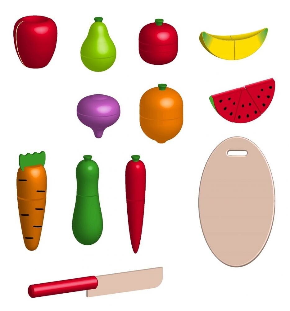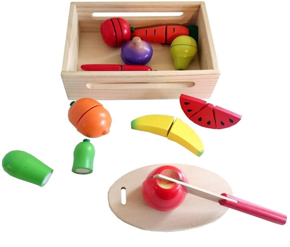 Овощи и фрукты для нарезки, изготовлены из лакированного дерева.