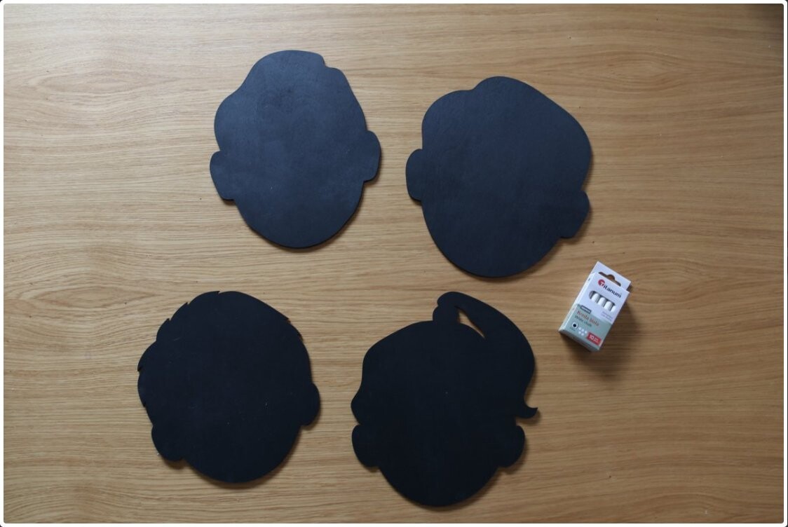 В комплект входят 4 деревянные доски, расписанные меловой краской в форме: женщина, мужчина, девочка и мальчик + пачка белого мела БЕСПЛАТНО.