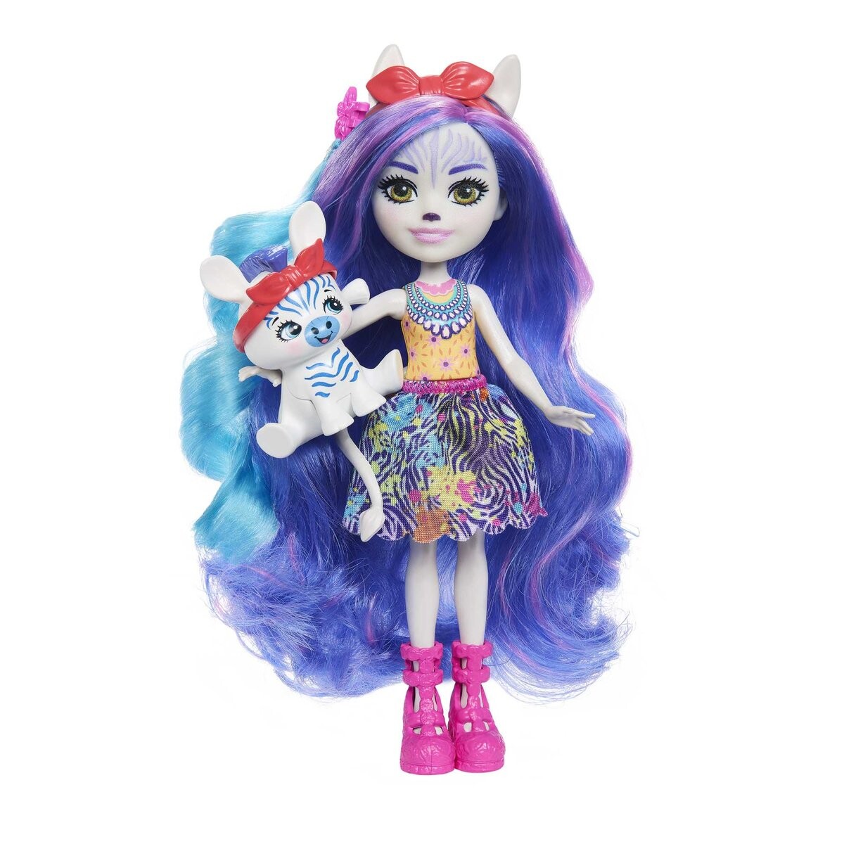 Земира Зебра — очаровательная кукла из коллекции Enchantimals Deluxe. У нее длинные густые фиолетовые волосы, которые можно укладывать с помощью прилагаемых аксессуаров. У куклы также есть съемная красочная юбка в полоску зебры. Enchantimals Deluxe