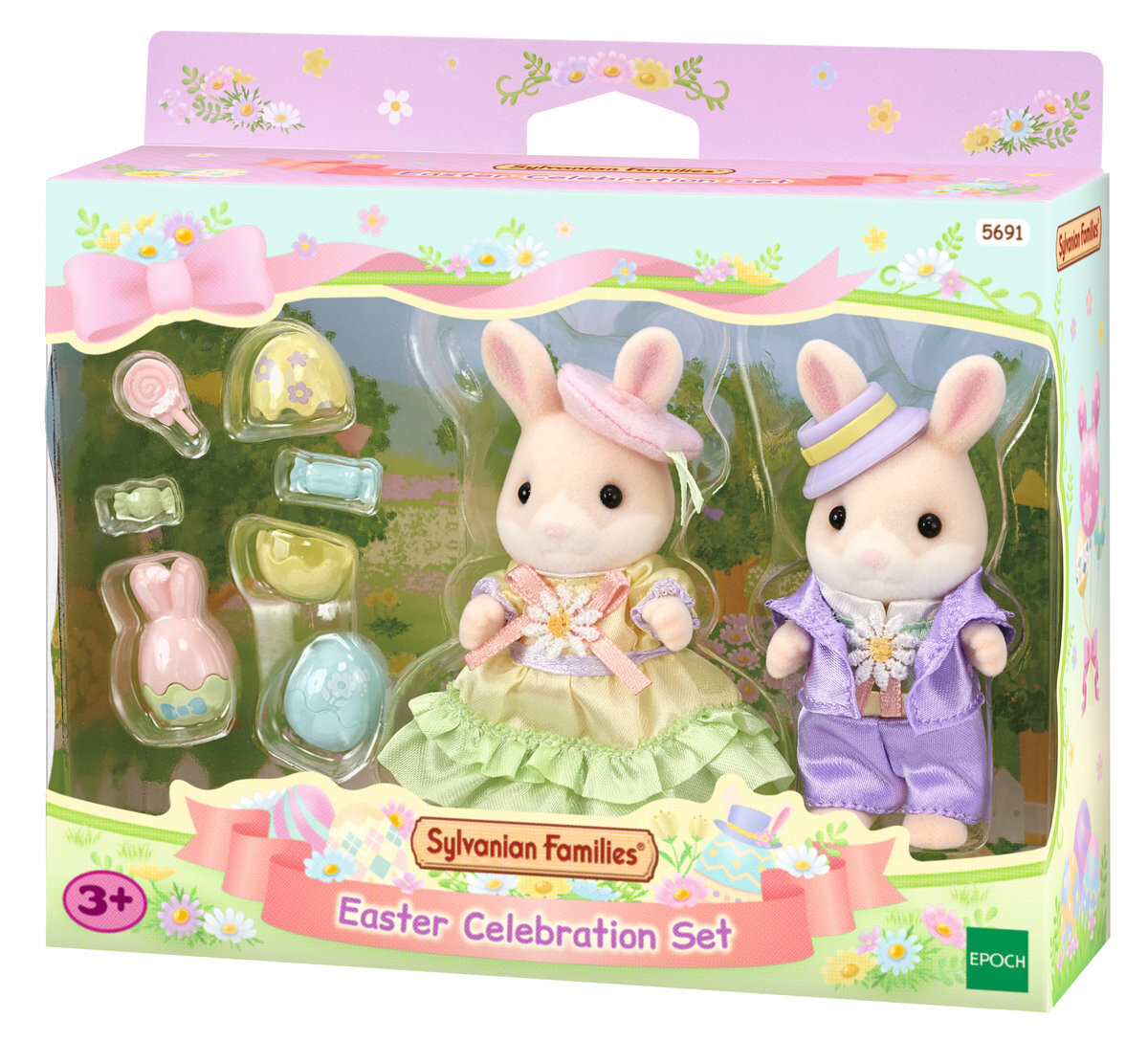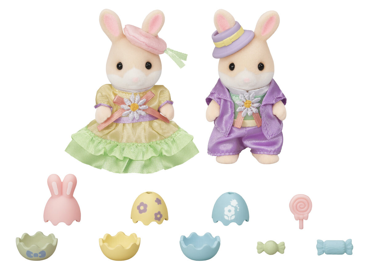 Набор «Зайчики в корзине» содержит двух кроликов из страны Сильванских семей, одетых в элегантные наряды весенних цветов. На девочке красивое платье, а на мальчике очень стильный костюм.