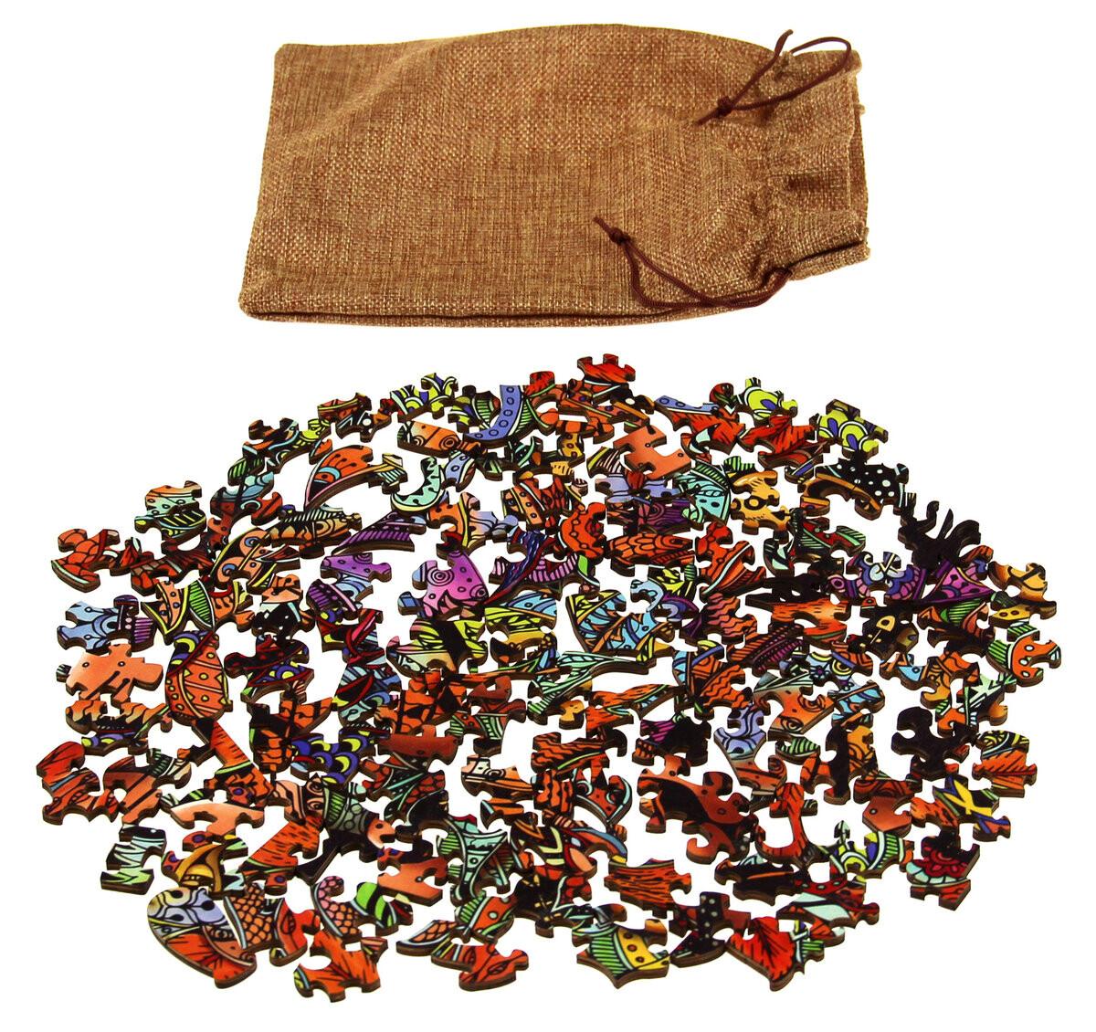 Новая серия Rainbow Wooden — это деревянные красочные головоломки. На выбор предлагается двенадцать уникальных дизайнов животных. Испытайте себя, разгадывая пазлы необычной формы — кроме того, в каждом узоре есть несколько элементов, имеющих форму животных или предметов! Найти их — большое удовольствие! Оригинальная форма, тщательное исполнение (деревянная фанера толщиной 4 мм) и широкая цветовая гамма (УФ-печать отличается точной передачей цветов графики) делают пазлы идеальным элементом декора для любого помещения. Eureka 3D Puzzle — уважаемый производитель головоломок в Европе. Разнообразный ассортимент, постоянное внимание к высокому качеству исполнения и большая забота об эстетике и интеллектуальной ценности предлагаемой продукции снискали компании признание во всем мире. Все представленные головоломки отлично работают в разнообразных группах. Они развлекают и учат они заставляют вас думать и раскрывают ваше творческое воображение. Они позволяют людям разного возраста найти «общий язык» и становятся началом большого увлечения, зачастую объединяющего целые семьи вокруг общего хобби. Проверьте, сможете ли вы решить удивительные головоломки от бельгийской компании Eureka. А может быть, у вас есть врожденная способность решать логические задачи? Вы решаете их быстрее других? Предлагаем вам ознакомиться с чрезвычайно изобретательными и очень качественно выполненными головоломками, решение которых доставит вам часы фантастического удовольствия. В нашем предложении есть логические головоломки для людей всех возрастов. Мы гарантируем большой интерес и массу удовольствия. В КОМПЛЕКТЕ: пазл из 116 деталей, льняной мешочек.