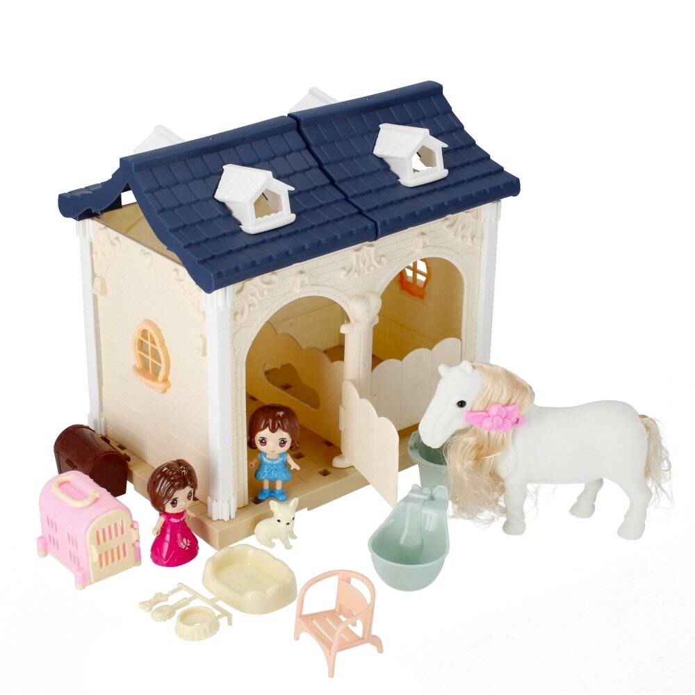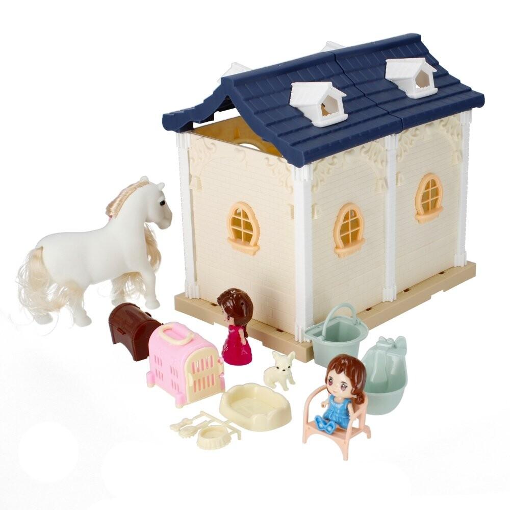 В комплект входят: конюшня с загоном, лошадь, 2 фигурки девочек, переноска, собачка, лежанка для собаки, миска, ящик, стул, ведро, коврик с травяной подстилкой.