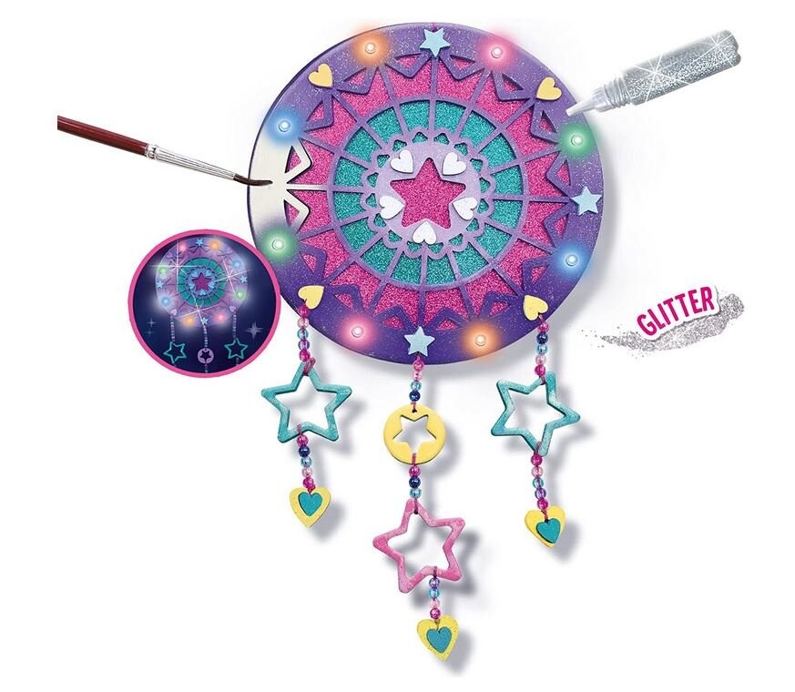Этот набор «Ловец снов Light Up Galaxy» приглашает маленьких мечтателей создавать творческие поделки. Сначала покрасьте деревянные детали в разные цвета и прикрепите к обратной стороне блестящую бумагу. Затем нанижите на нитку звездочки, сердечки и бусины и повесьте на ловец снов. Клей с серебряными блестками обеспечивает идеальную отделку. Светодиодный кабель найдет свое место на задней части рамы, а красочная подсветка обеспечит красивый конечный эффект. Подробное руководство объясняет каждый шаг, поэтому ничего не пойдет не так!