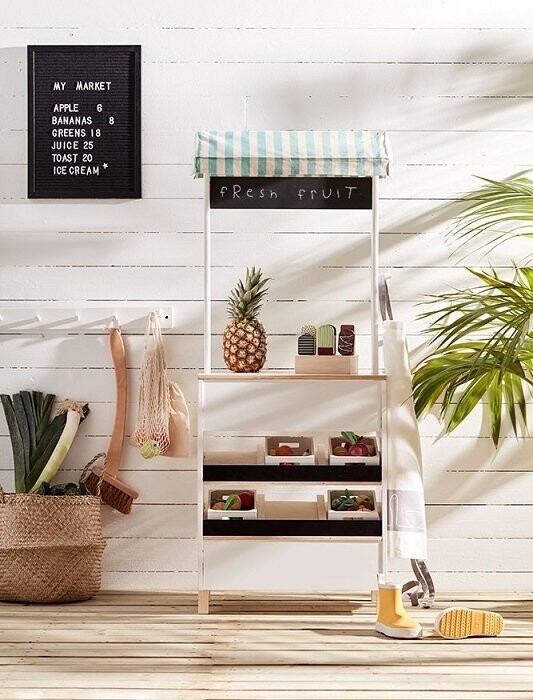 • оснащен стойкой, двумя открытыми просторными полками с меловыми досками спереди для маркировки продаваемой продукции и две вешалки для сумок с покупками