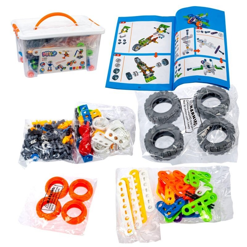 Пластиковые строительные блоки (167 штук), из которых мы строим различные виды транспортных средств и машин (10 различных моделей). Входящие в комплект элементы доступны в различных цветах (зеленый, серый, оранжевый, желтый). Все было упаковано в коробку на маленьких колесиках с ручкой. Благодаря этому мы можем легко переместить весь набор в любое место.