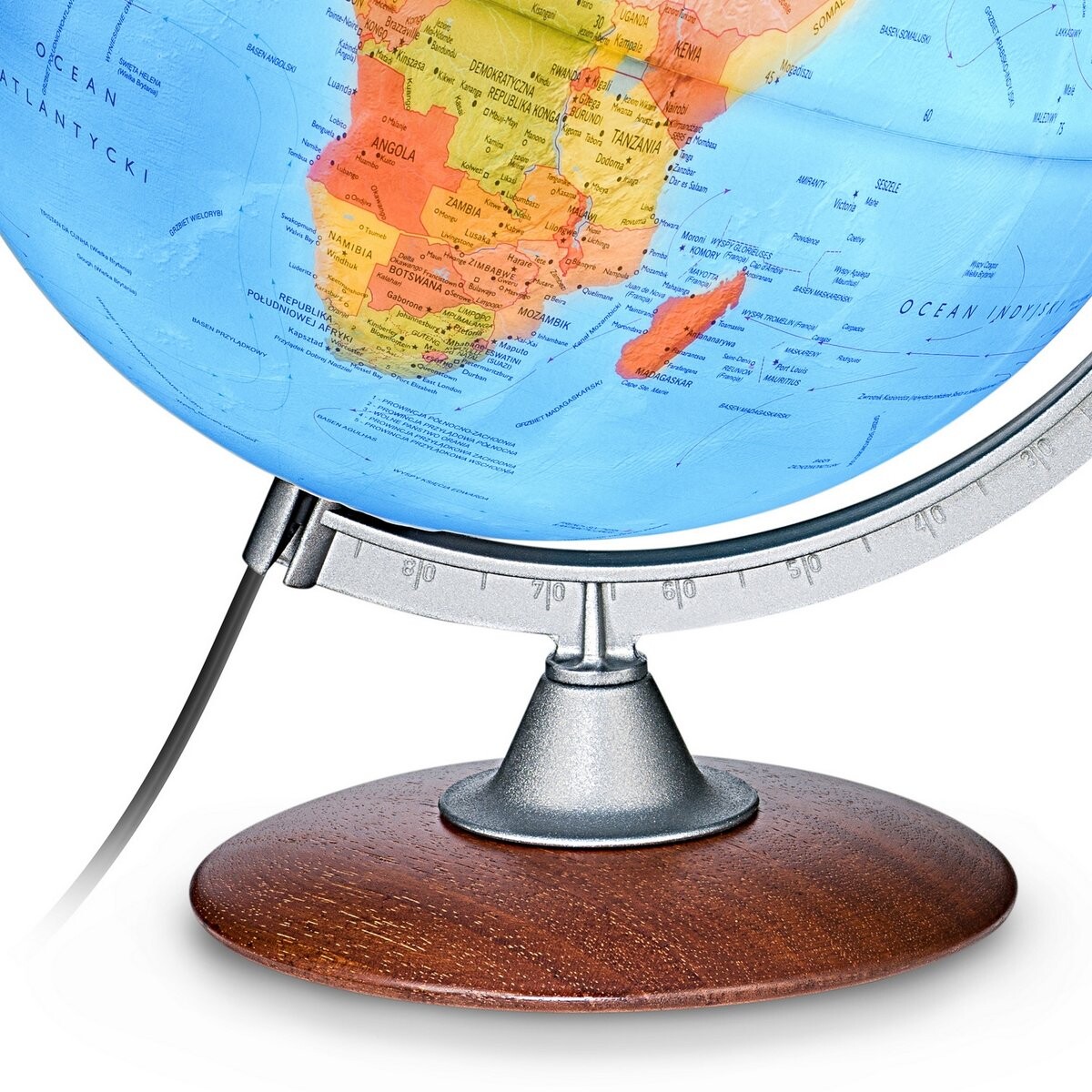 Крепится на деревянную основу и меридиан. Карта на польском языке. Размер мяча 30 см. высота 38 см. Легкая замена лампы.
