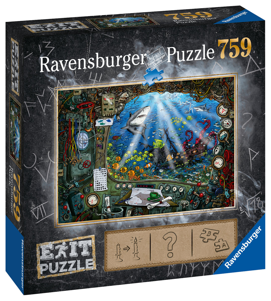 Содержимое коробки:пазл из 759 деталей с мотивом «Подводная лодка», конверт с подсказками, инструкция с QR-кодом.
