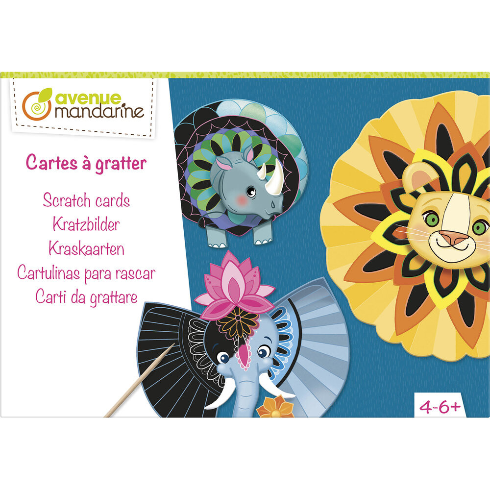 Скретч-доски Avenue Mandarine. Простой метод, который позволяет каждому ребенку постепенно открывать для себя яркие цвета, скрытые под слоем черного цвета на четырех милых животных. Узоры, вдохновленные мандалами. Эти карточки затем можно приклеить к красочным рамкам и разместить на красивых картонных подставках.