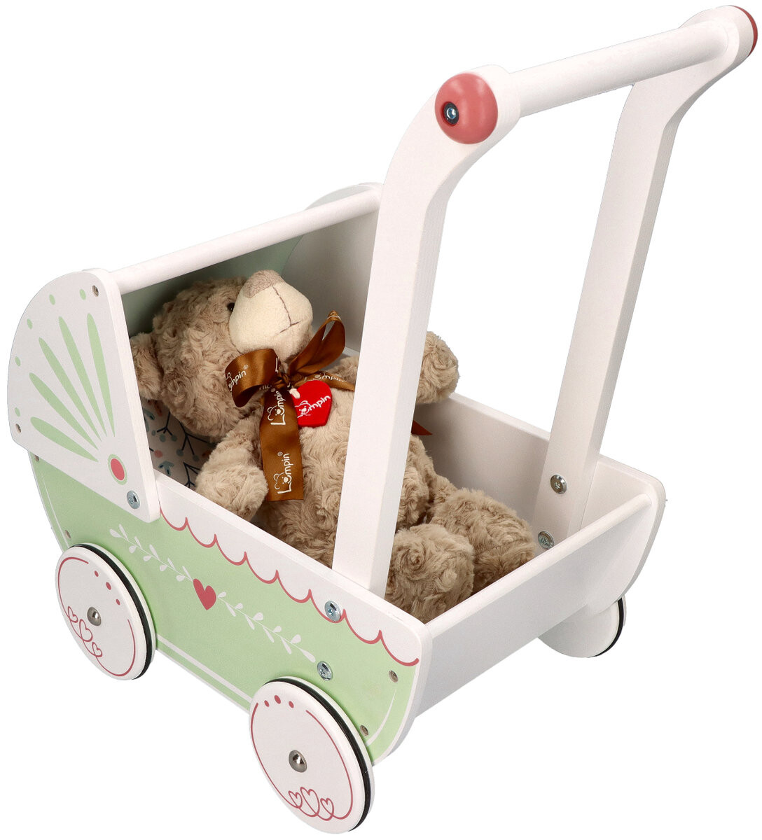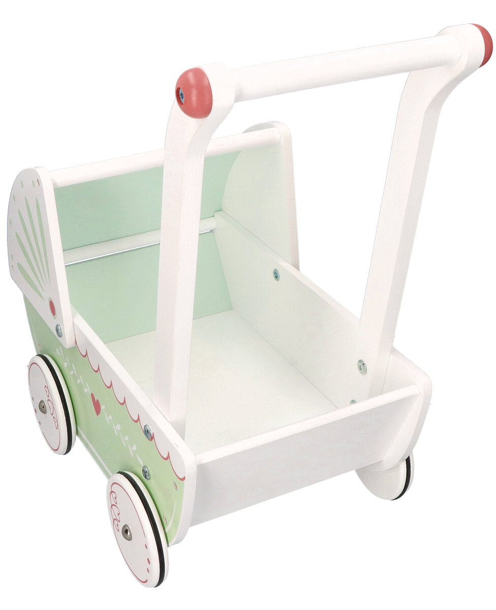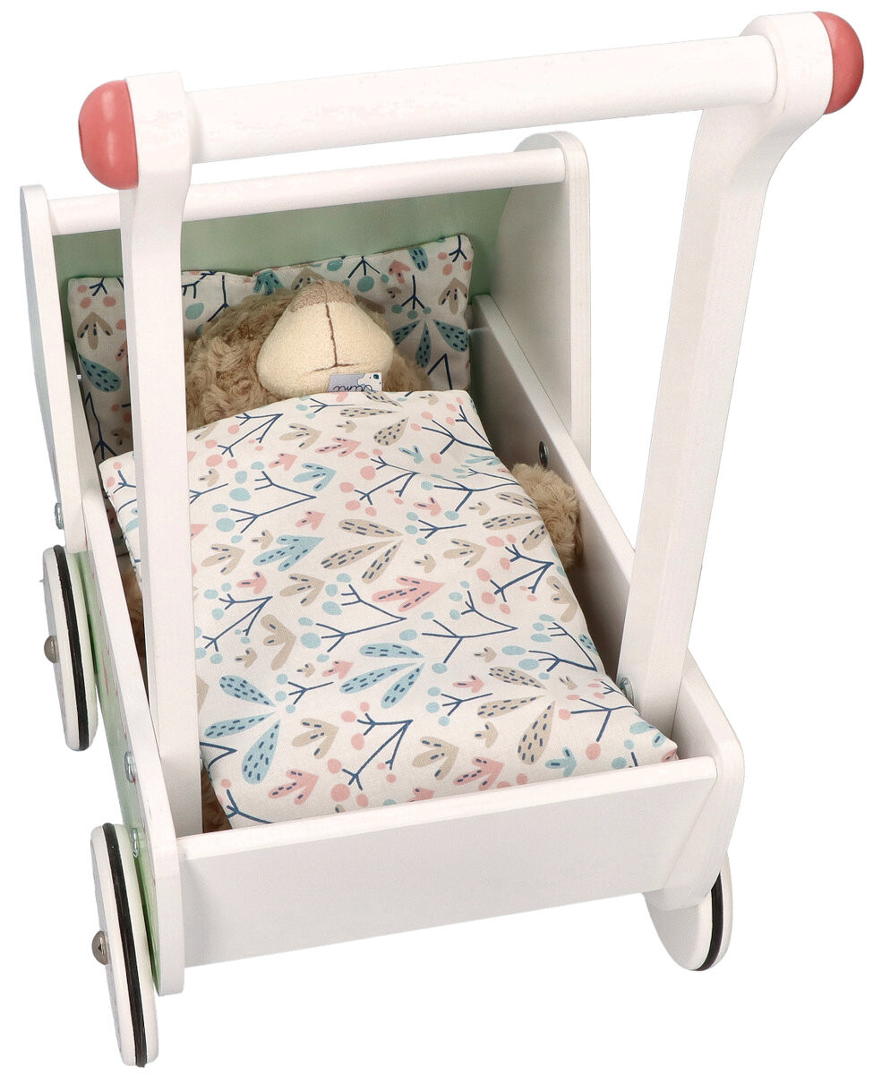 Что отличает наш товар от других: *красивый, нежный дизайн *материал из которого она изготовлена - дерево *противоскользящие резинки на колесах *овальная форма капюшона *изогнутая ручка для толкания коляски, облегчает ходьбу и толкание