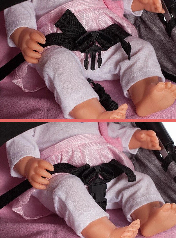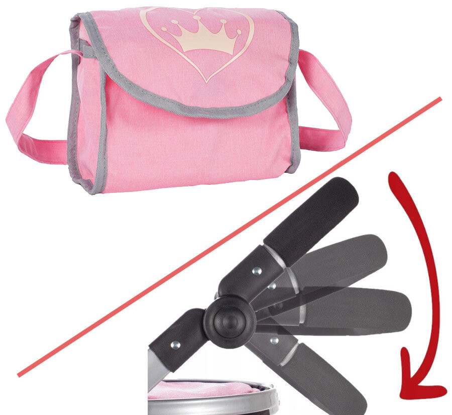Коляску можно легко сложить, нажав красную кнопку на передней части коляски. коляска. В сложенном виде занимает мало места. Кроме того, замок коляски предотвращает ее складывание, что делает игру очень безопасной. В комплект входит: