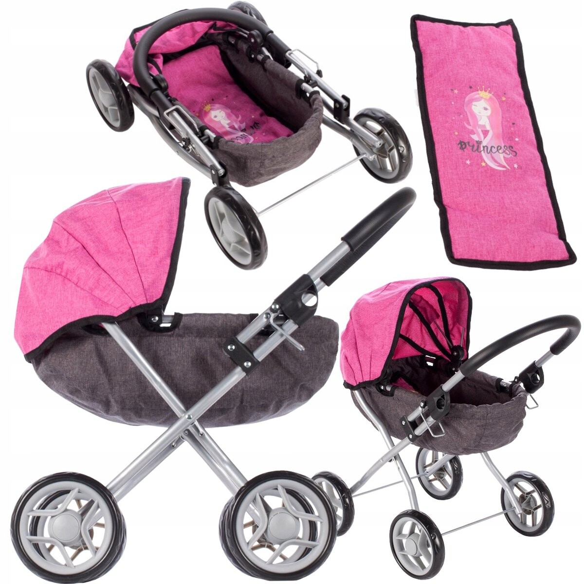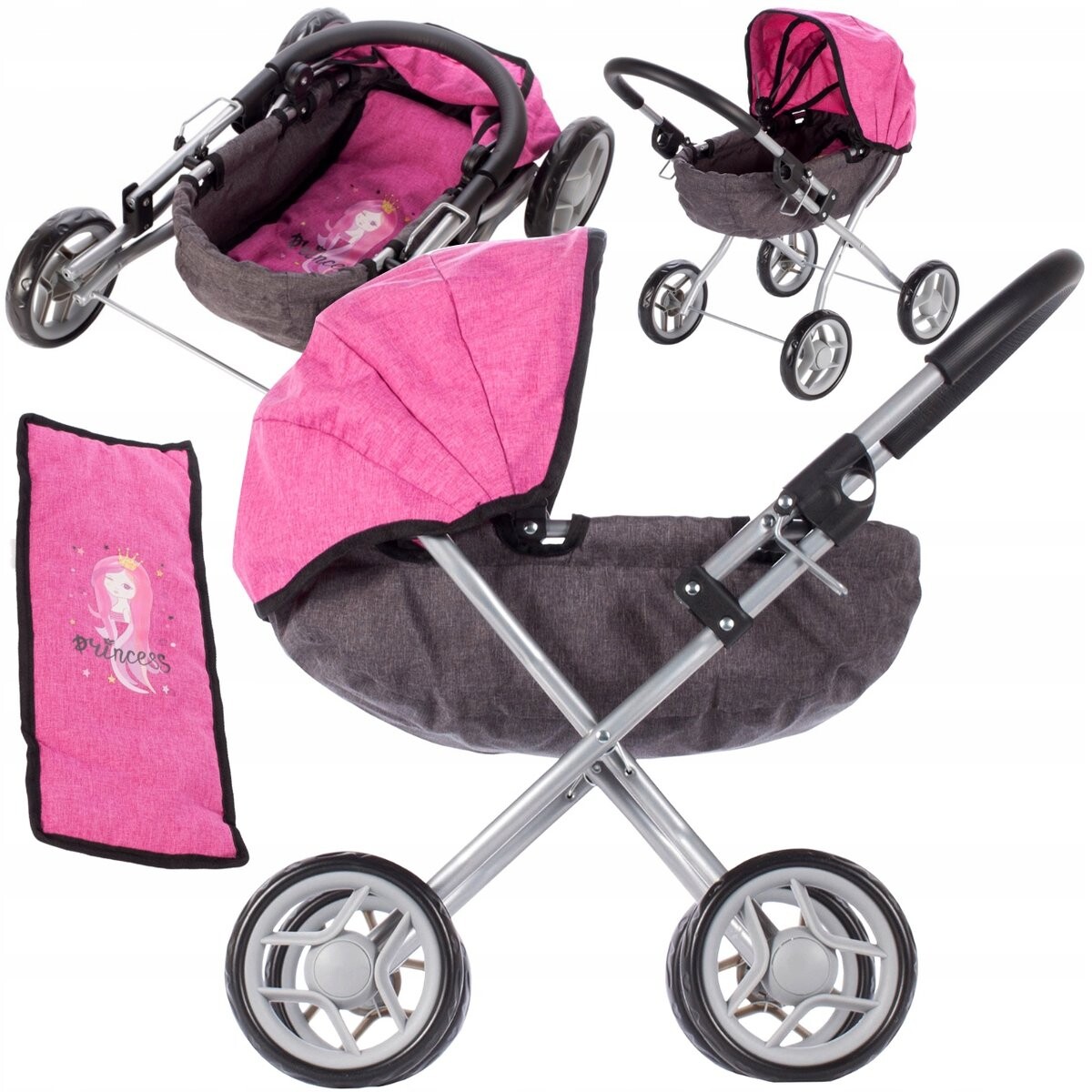 Представляем вам красивую глубокую кукольную коляску красивого розового цвета с мотив принцессы. Каждая маленькая девочка любит гулять со своими куклами. Теперь он может взять их с собой на прогулку в этой очаровательной коляске. Чехол коляски изготовлен из очень прочного и тщательно сшитого материала. Коляска чрезвычайно функциональна и очень легко складывается . так что вы сможете быстро и без проблем положить его в коробку.