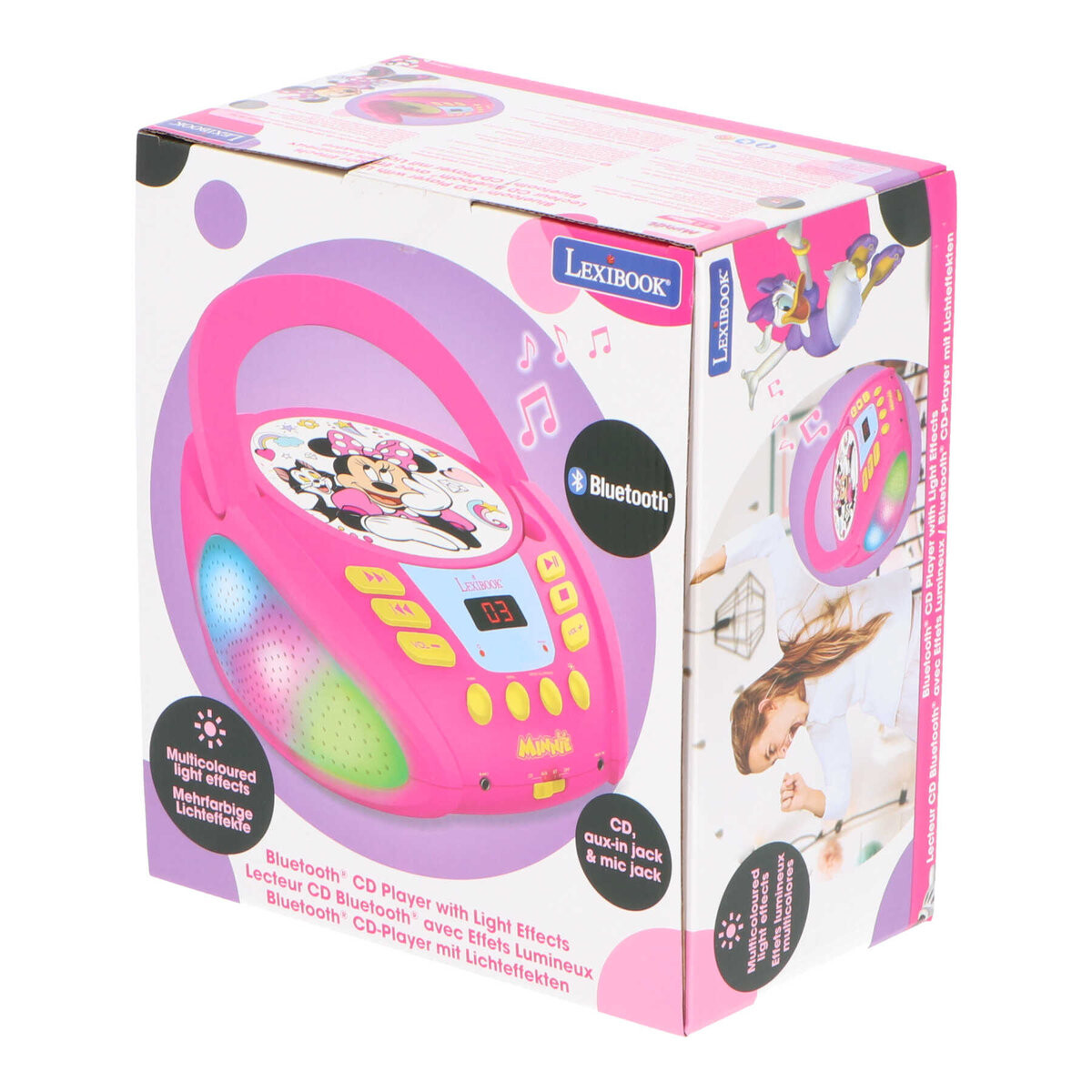 БУМБОКС CD-ПЛЕЕР - МИННИ МАУС Производитель: Lexibook Код товара: RCD109MN Размеры упаковки: 22,5 х 25,5 х 13,5 см Вес: 1,30 кг CD-плеер, украшенный графикой из мультфильма МИННИ МАУС. Качественное устройство со световыми эффектами. Устройство оснащено проигрывателем CD, CD-R, CD-RW и имеет возможность программирования и повтора песен. Также имеется вход AUX для подключения mp3-плеера. Встроенный Bluetooth-приемник позволит вам воспроизводить музыку, например, с мобильного телефона. Многоцветные эффекты отлично подходят для двух динамиков. Устройство питается от сетевого кабеля (входит в комплект) или от 6 батареек LR14 (не входят в комплект). В КОМПЛЕКТ ВХОДЯТ: ✔ CD-проигрыватель✔ Кабель питания✔ Руководство✔ Упаковка