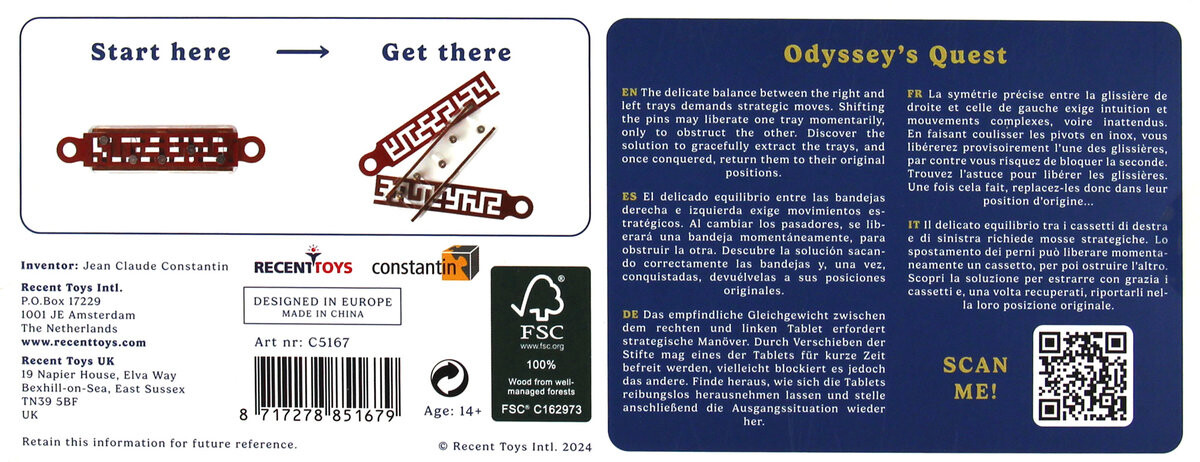 Поддержание тонкого баланса между правой и левой сторонами требует тщательно продуманных движений. Перемещение штифтов может на мгновение освободить одну сторону, но заблокировать другую сторону. Разделите две части, а затем верните их в исходное положение. Жан-Клод Константин, несомненно, один из самых занятых дизайнеров головоломок за последние тридцать лет. Уникальные и разнообразные идеи, возникающие в его голове, превращаются в уникальные и визуально ошеломляющие проекты. Головоломки Жан-Клода считаются очень сложными. Для их решения вам понадобится высокая активность серого вещества, соответствующая концентрация и немного воображения. Recent Toys — производитель головоломок из Нидерландов. Как они говорят о себе: «Они создают пазлы для всех. Если вам нравится математика, логика, расстановка закономерностей или вы просто терпеливы и настойчивы тогда вы обязательно найдете что-то для себя! Хотя все головоломки уникальны, у них есть следующие общие черты:1. Простота – загадки легко объяснить. Наш разум должен сосредоточиться на решении головоломки, а не на понимании правил. 2 . Мудрость – головоломки призваны заставить наш разум расширить свой кругозор и открыться новым идеям. 3 . Долговечность – пазлы изготовлены из соответствующих материалов. Элементы можно перемещать с исключительной легкостью. Ходят плавно, быстро и не заедают. Примите вызов! Улучшите состояние своего ума! СОДЕРЖАНИЕ: Книга-пазл Odyssey's Quest (размеры: 5х20 см).