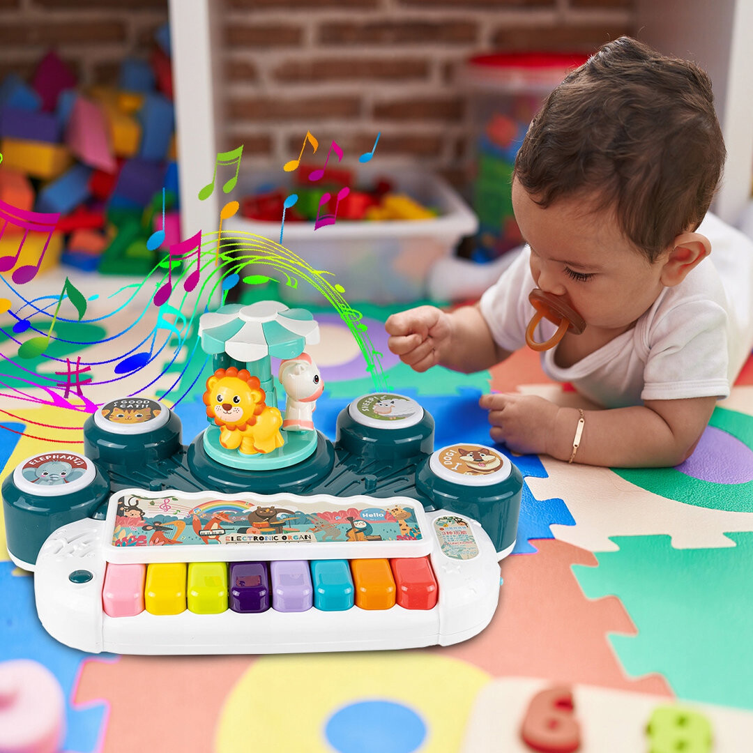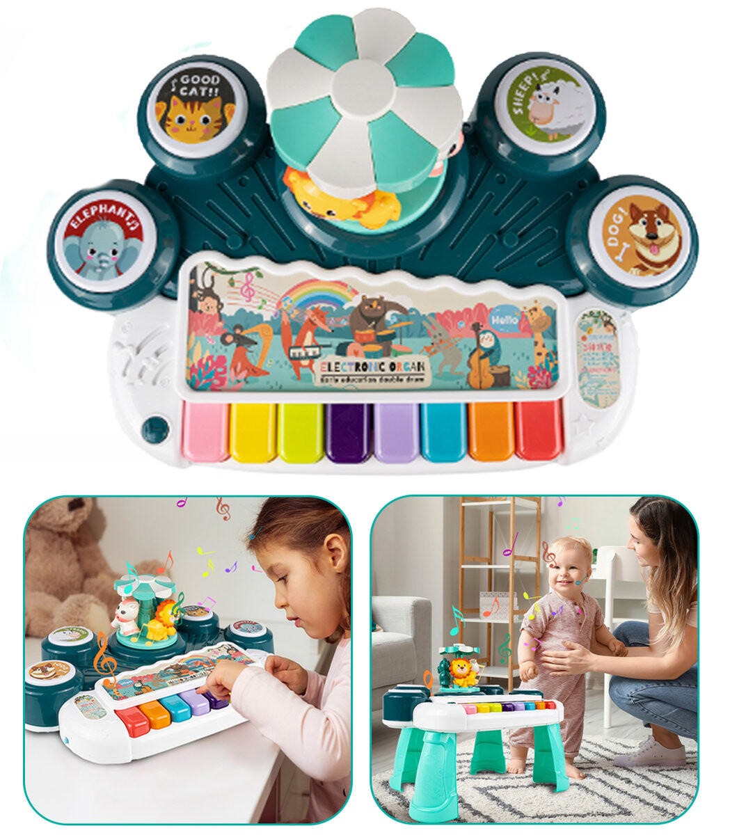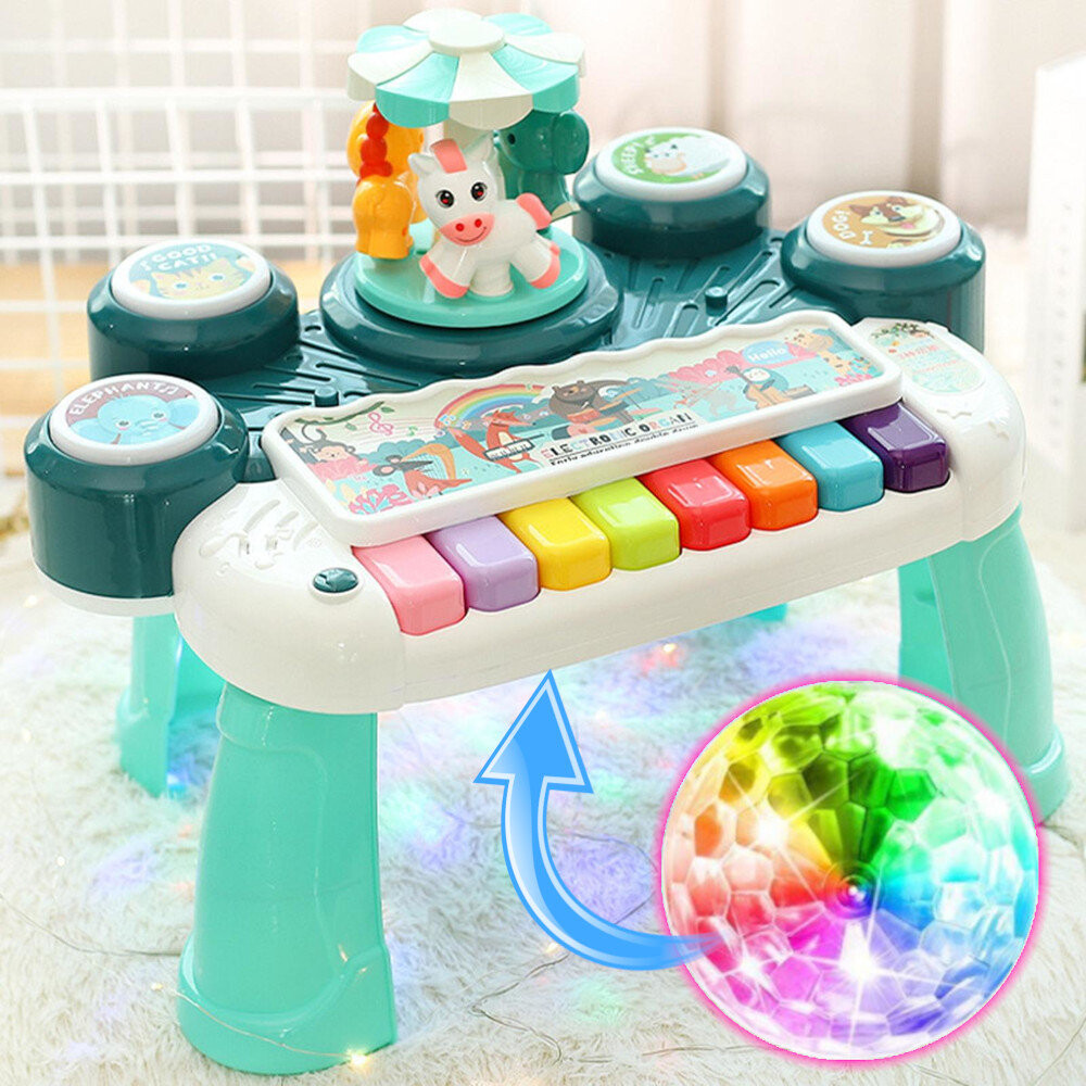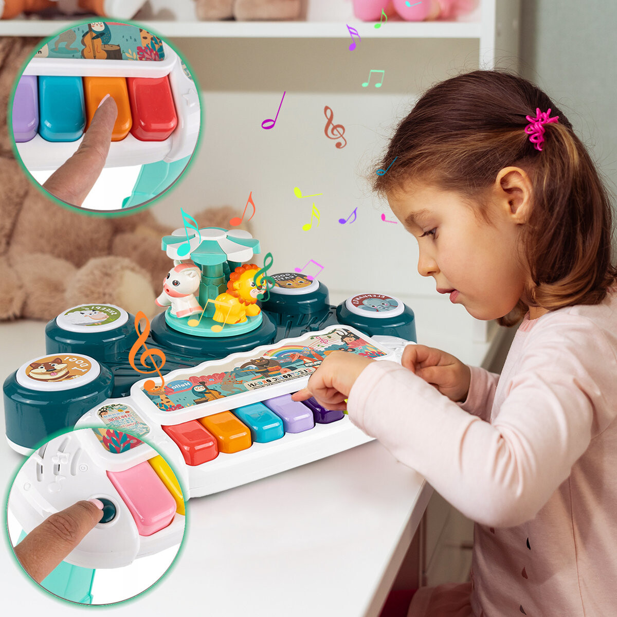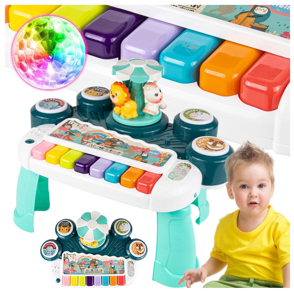 ➡Первый режим - ребенок может играть на пианино До-Ре-Ми-Фа и 4 барабанах + загорается ДИСКО-шар + крутится карусель