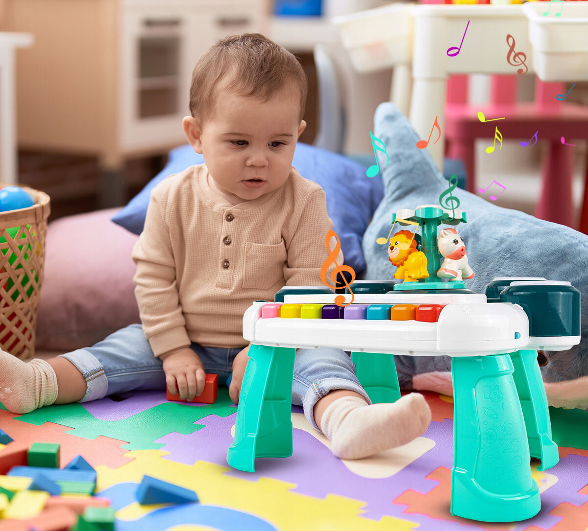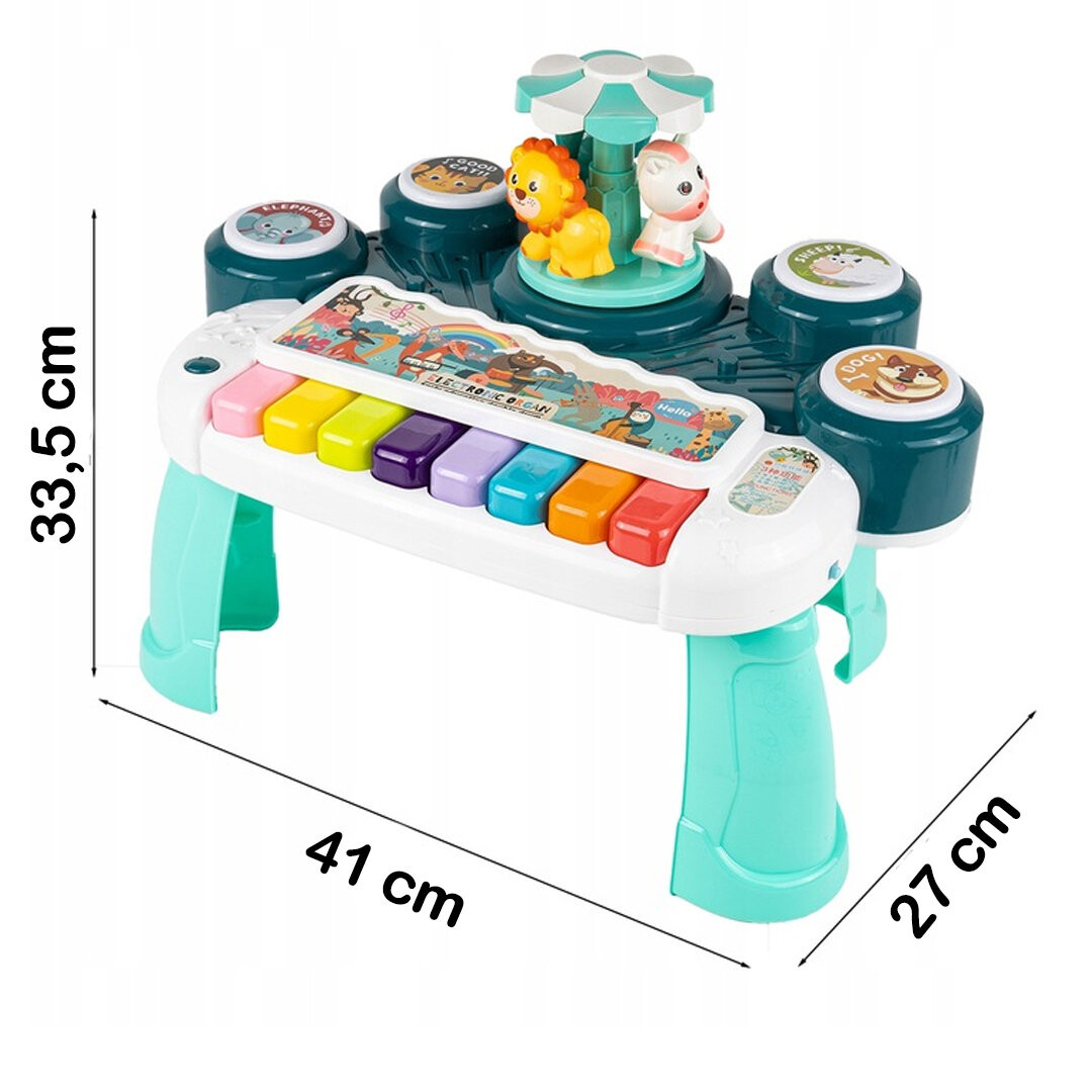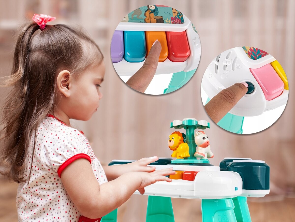 ➡Третий режим - играет на пианино + загорается ДИСКО-шар + крутится карусель и дополнительно ребенок может сыграть в игру, в которой он нажимает соответствующую кнопку барабаните, издавая звуки различных животных. Возможность разобрать ножки стола