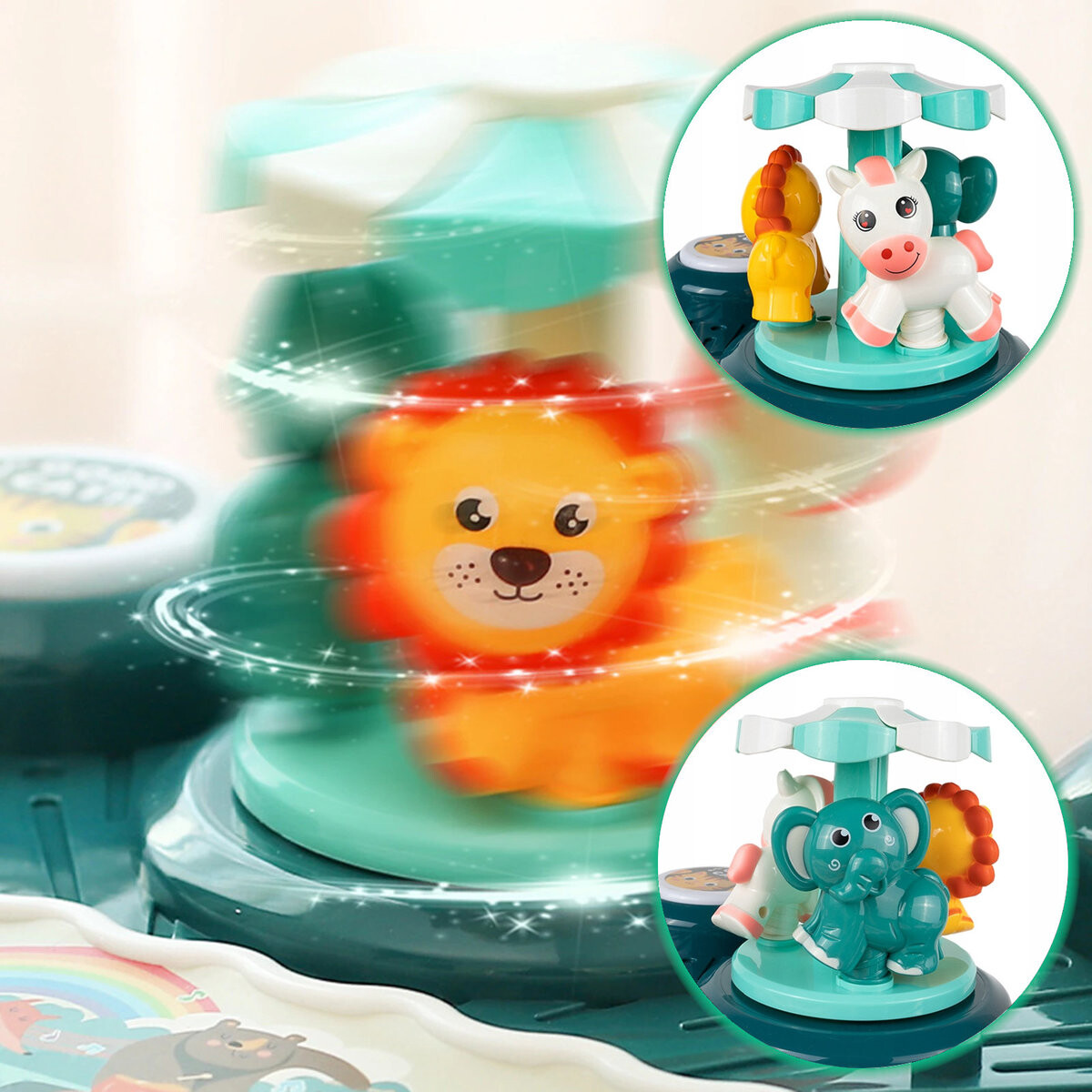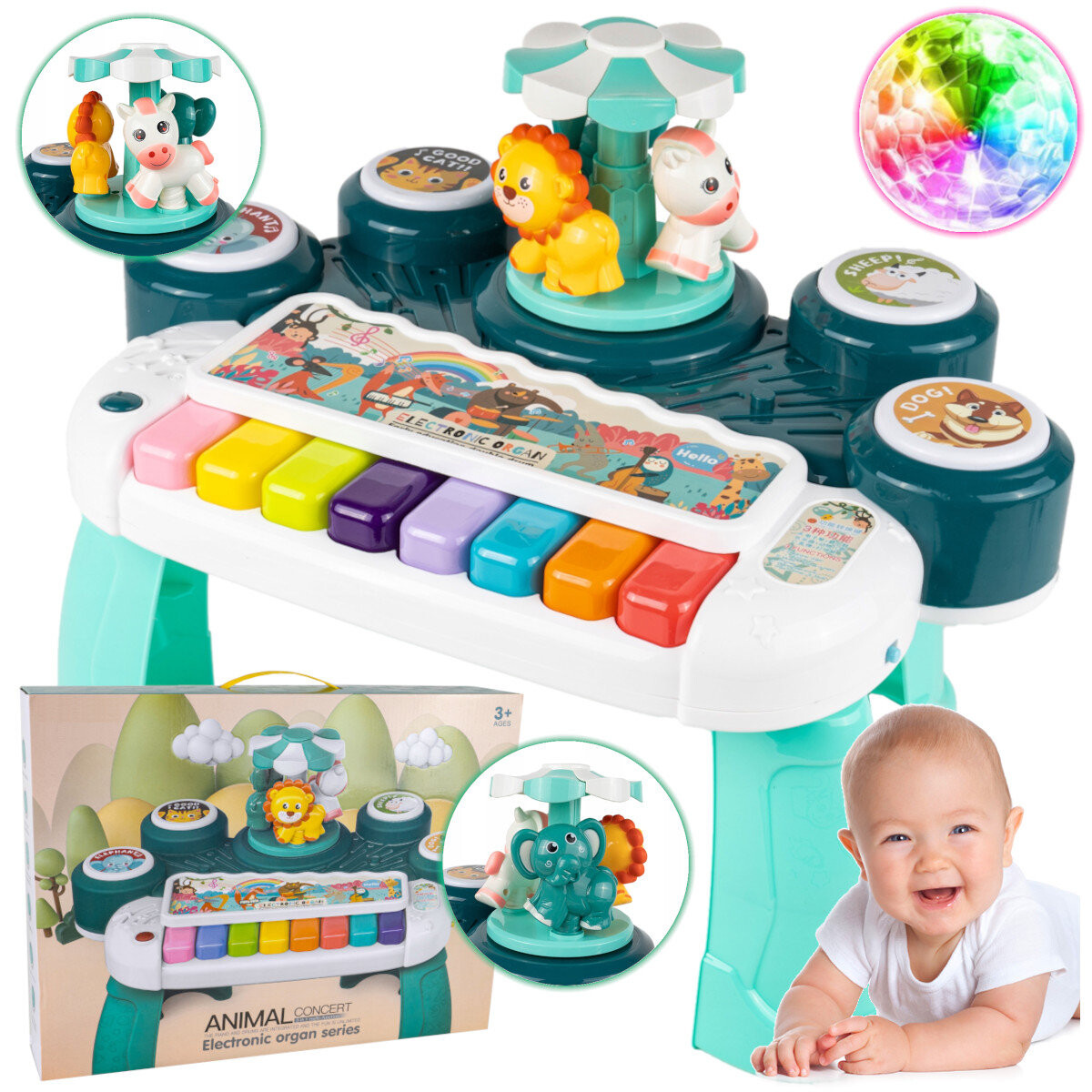 ➡Второй режим - нажимая на клавиши мы будем слышать веселые мелодии, а нажимая на барабаны - мы слышим звуки животных + загорается ДИСКОШАР + крутится карусель