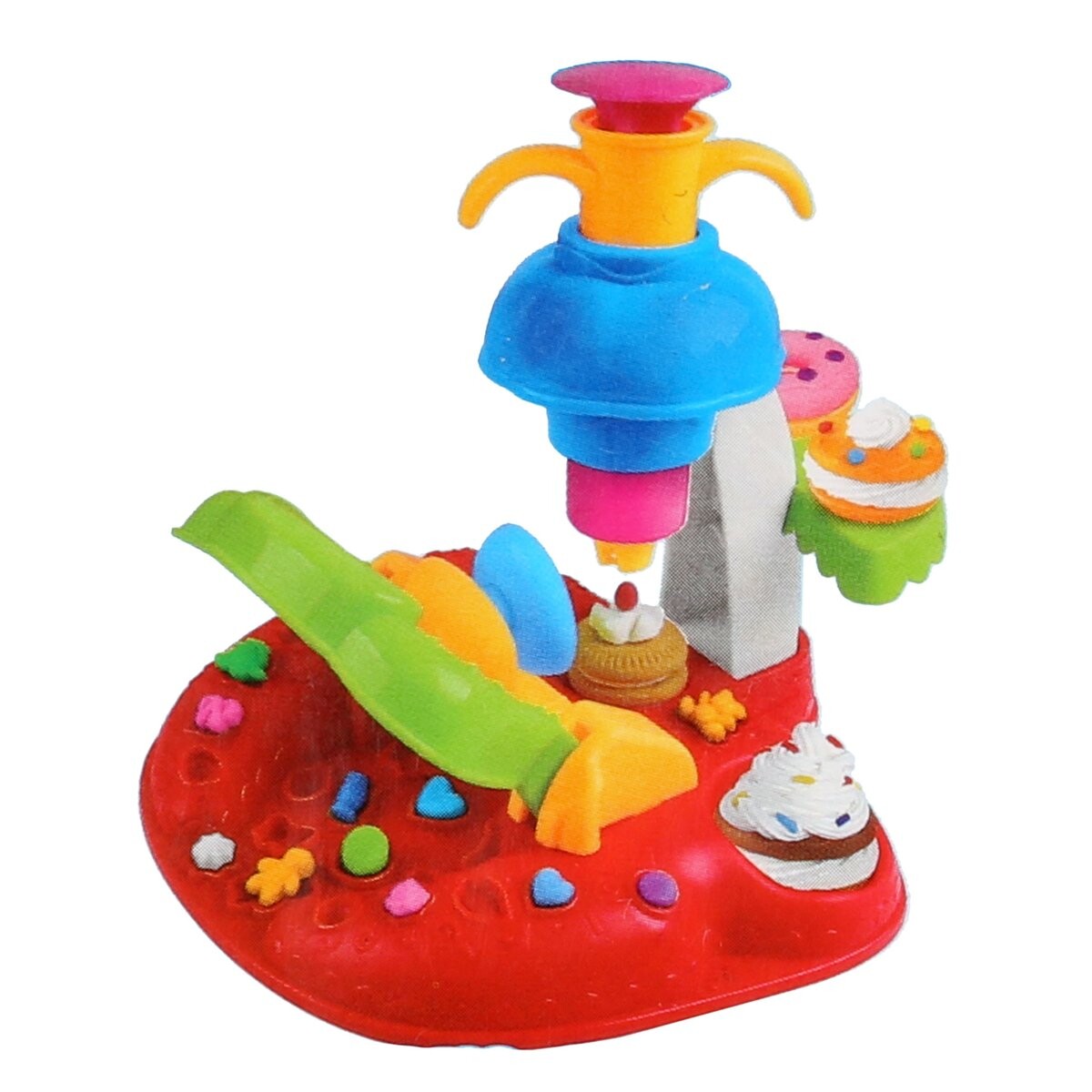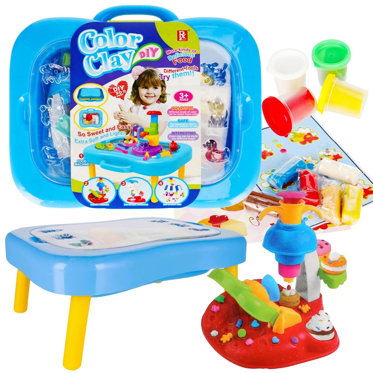 Состав набора:стол в виде чемодана, 4 коробки с пластичной массой, дополнительные цвета массы в пакете, аппарат для приготовления десертов, формочки, ножницы для вырезания массы, скалка.